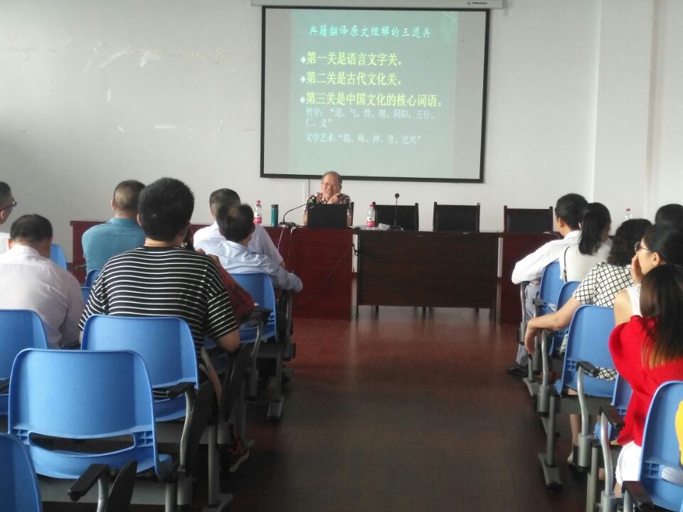潘文国教授做了关于“典籍翻译漫谈”的专题讲座。潘教授用严谨又不失风趣的语言解释了翻译之难,提出典籍翻译的三道难关:语言文字关、古代文化关和中国文化的核心词语关。深刻阐释了哲学中“道”“气”“性”“理”“阴阳”“五行”“仁”“义”等术语的精髓,及文学艺术中“韵”“味”“神”“骨”“比兴”等的核心内涵。
