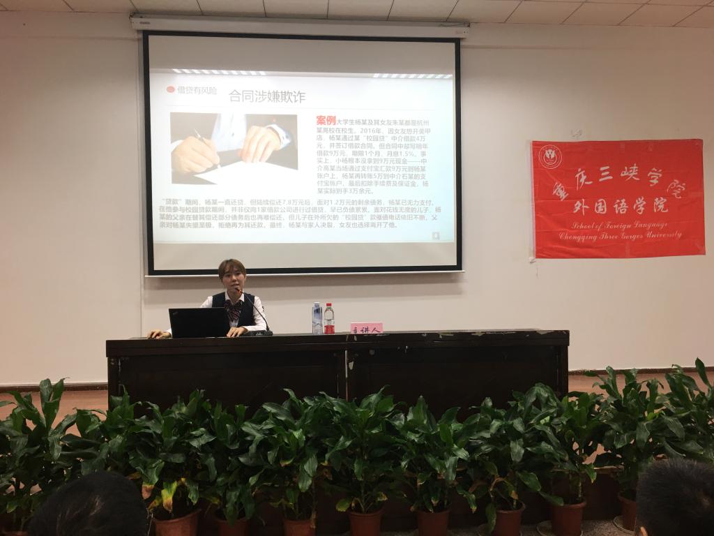 活动过程中,主讲人从近年来发生的多起“校园贷”恶性典型案件切入,结合“校园贷”的财务管理本质、校园贷辩证分析,提醒同学们要“理性消费,树立正确的消费观,远离滥贷,警惕风险”。令人印象深刻的是在介绍校园贷的套路时,主讲人结合生动的视频为同学们深入介绍了利率、逾期罚息、平账等校园贷中的犯罪套路。最后他通过具体实例劝诫和警示新生们要珍惜保护自己的个人信息,防范并远离校园贷。