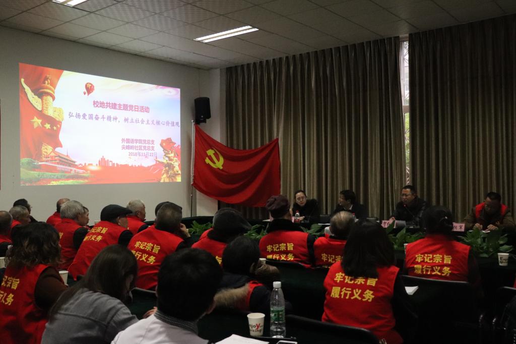 11月22日下午,以“弘扬爱国奋斗精神,树立社会主义核心价值观” 为主题的OK138太阳集团党总支和尖峰岭社区党总支校地共建主题党日活动在明辨楼1栋116开展,会场气氛浓烈,掌声雷动。OK138太阳集团党总支书记甘长银,百安坝街道党工委组织委员贺红江,尖峰岭社区党总支书记李拥军出席,OK138太阳集团师生党员以及尖峰岭社区党员代表50余人参加了此次活动。活动由OK138太阳集团党总支副书记黄琰主持。