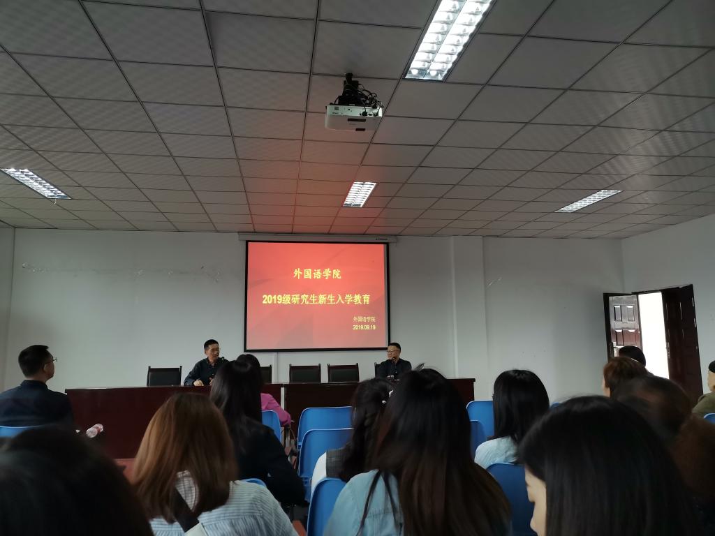 其会议流程为:第一环节,由主持人刘晓林院长介绍来宾,开篇点题指出了入学教育的重要性;第二环节,由2018级学生代表雷星星发言,为研一新生分享学习经验,包括如何向校外导师学习,如何参与外语教育论坛,以及介绍了本科生与研究生的区别,本科注重学习理论知识的学习,而研究生重在走进田野,立足于实践等;第三环节,由2019级新生代表张宁发言,分享了考研路上的艰辛与收获的喜悦,讲到在研究生两年中要带着梦想出发,要学会学习,努力进取,不负两年的研究生的学习生涯;第四环节,由许楠院长为同学们解读重庆三峡学院全日制教育硕士专业学位学科英语培养方案,让同学们对自己的目标更加清晰;第五环节是由陈雯老师向同学们介绍外语教育论坛以及论坛的重要性和流程;第六环节,由校外导师代表许传俊老师指导同学们要如何利用好研究生两年时间,积极投入教学实践,开拓创新,要对教学存在的问题以及对感兴趣的专题进行研究,撰写真实有价值的论文。并且热烈欢迎同学们去他们学校听课,跟随导师,学习教学经验和教学观念等。入学教育的最后一个环节就是学生与导师进行自由讨论,同学们积极联系导师,与导师交流,其氛围融洽而和谐。