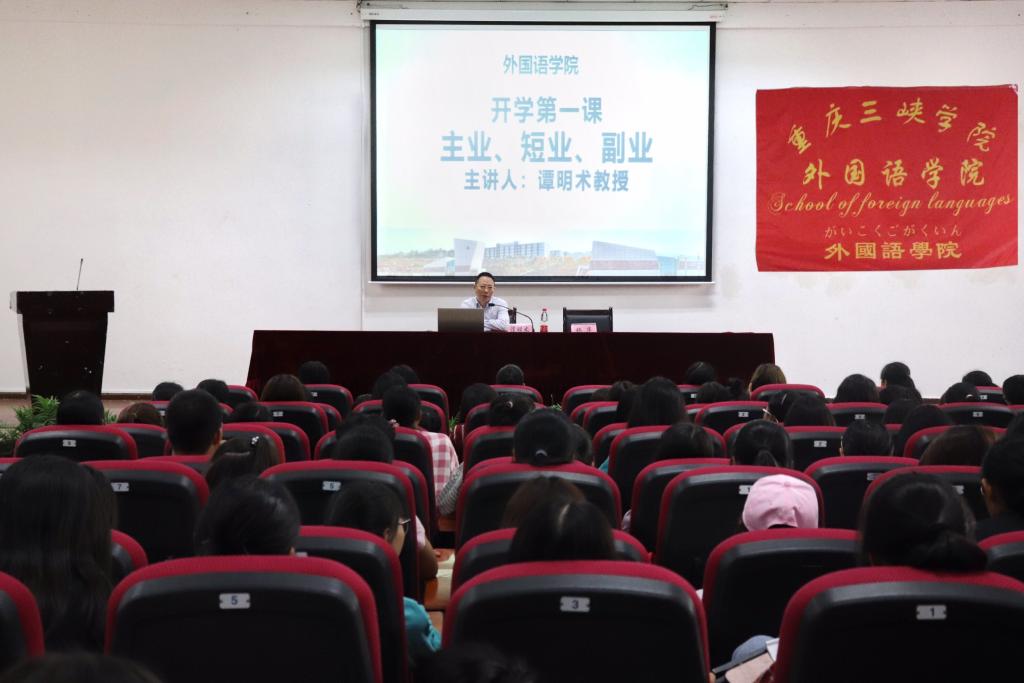 为了帮助2019级新生更好更快融入大学的学习生活,书写人生新篇章,9月23日上午10:30,在明辨楼2栋106,学校党委常委、副校长谭明术教授为新生做了题为“主业、短业、副业”的开学第一课。