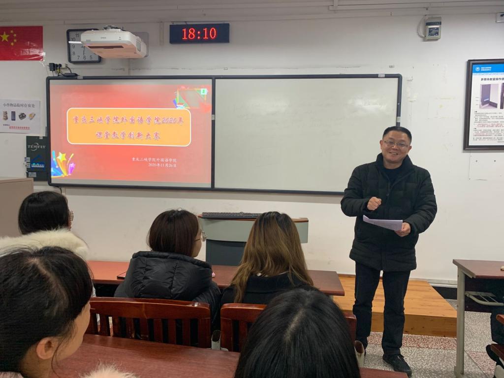 按照学校《关于举办教师课堂教学创新大赛的通知》要求和安排,我院于11月26日举办了院内课堂教学创新比赛。本次比赛分副高组、中级组两个组别,以现场授课、创新成果汇报两个形式进行,主要从教学设计、教学组织、改革创新、教学效果等方面进行评审。学院院长刘晓林教授、副院长唐淑华教授、英语系主任乔春华副教授以及肖祎副教授、鄢家琼副教授担任评委,学院10余名教师到场观摩。