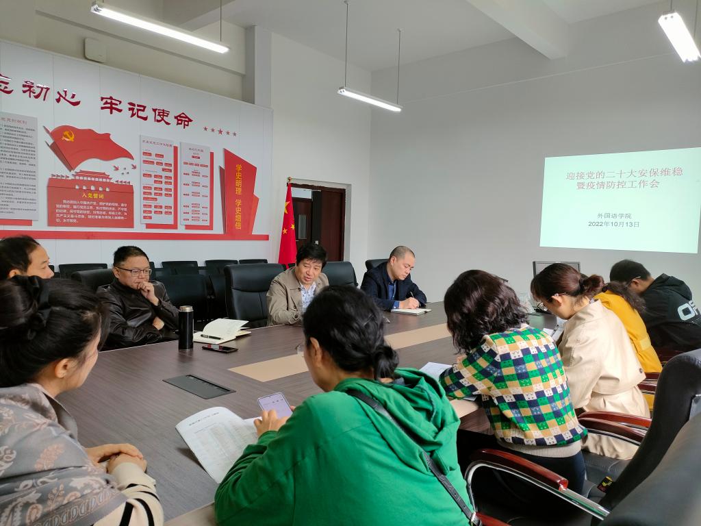 10月13日上午,我院在博学楼3栋315会议室召开关于做好党的二十大期间校园安全稳定暨疫情防控工作会议。学院领导班子成员、办公室工作人员、学工办工作人员参会,会议由党总支书记甘长银主持。