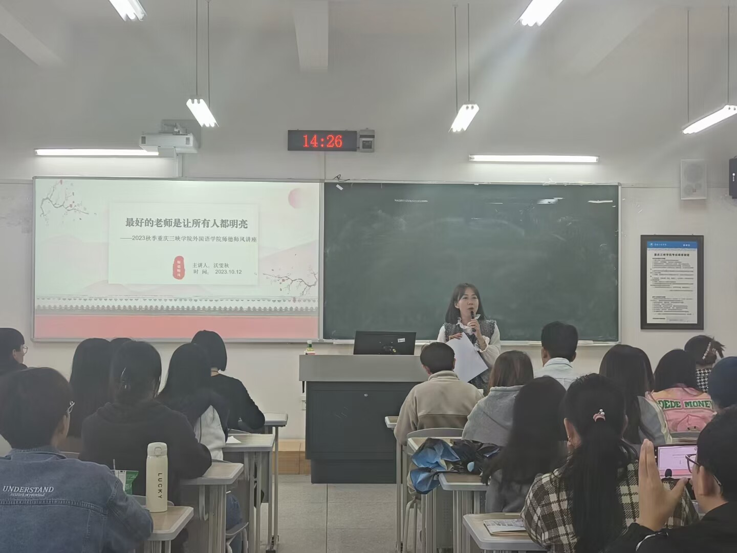 2023年10月12号下午2点半,OK138太阳集团2021级英语师范专业《教育研习》之师德体验专题讲座在博学楼1栋105教室顺利举行。本次讲座邀请到重庆市英语骨干教师、万州区新田中学工会主席沃雯秋老师担任主讲嘉宾,2021级全体英语师范生到场聆听了讲座。课程任课教师、学校研究生处副处长许楠主持讲座。