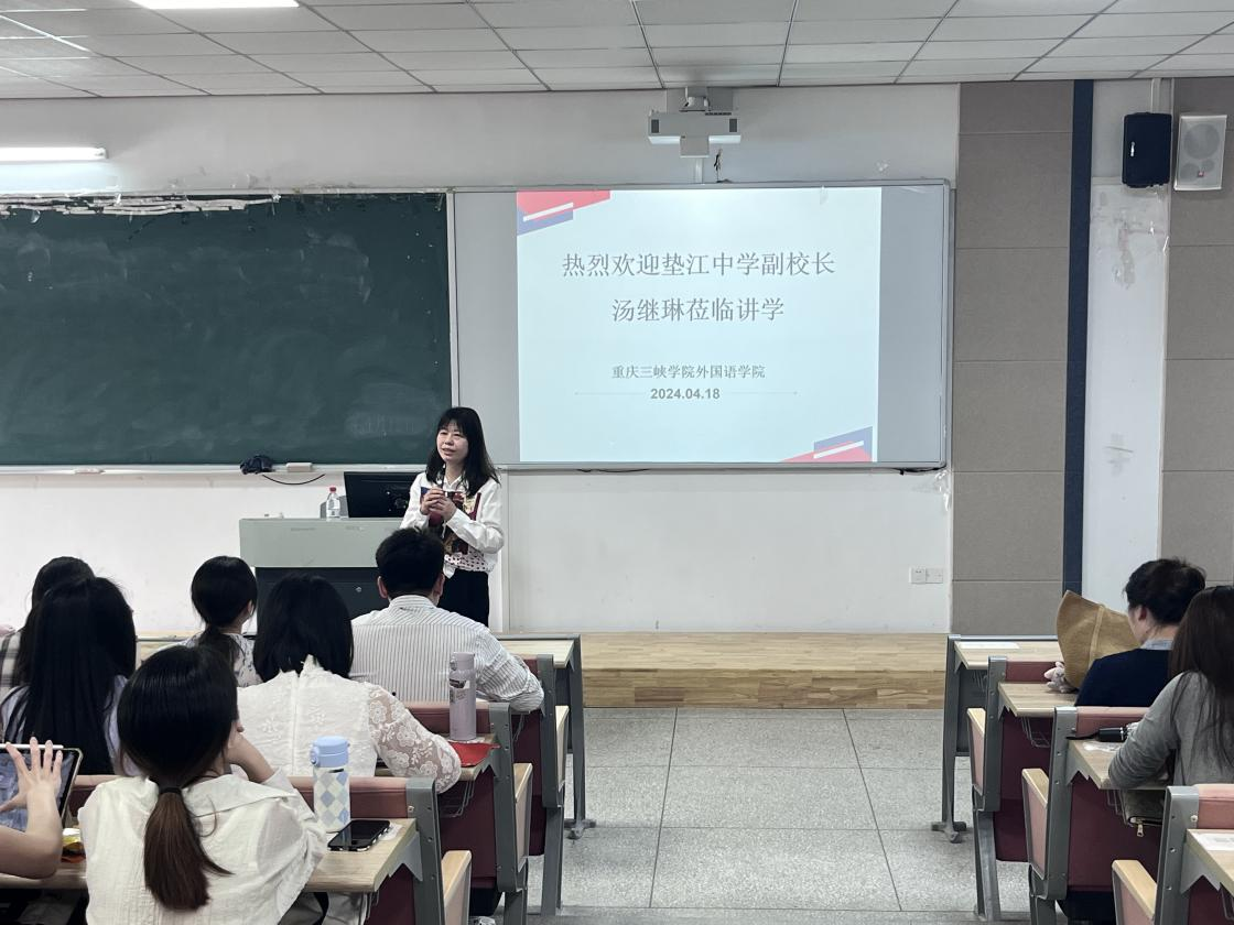2024年4月18日下午两点半,重庆市初中英语教学名师、垫江中学副校长汤继琳老师在博学楼1栋101室为我院全体研究生做了“初中英语跨学科主题活动”学术讲座。学校研究生处副处长许楠主持讲座。