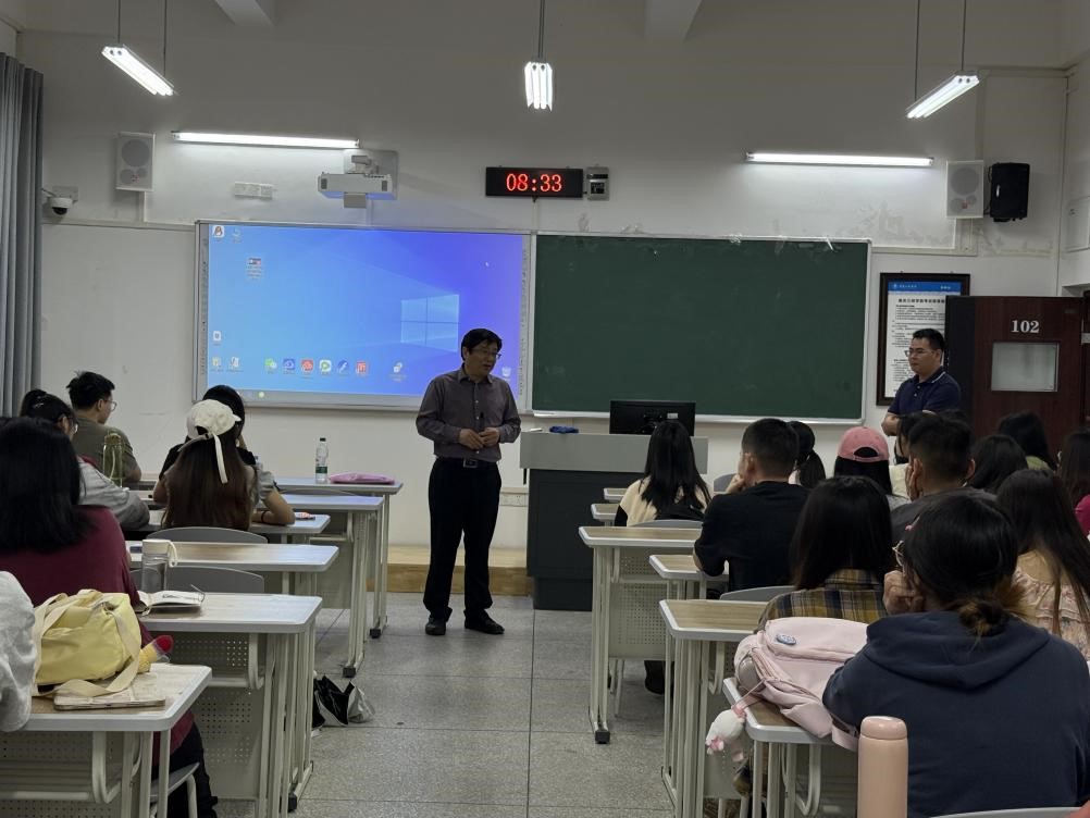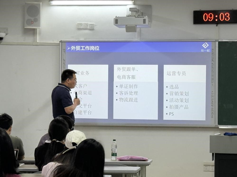“在一起”负责人张腾先主任分两场向我院2022级的同学们详细介绍了公司概况及外贸行业前景、工作内容及薪酬福利、招聘流程,企业对人才素养和能力的要求,以及到该公司及该公司合作企业实习就业的前景等内容,并回答了同学们的提问。