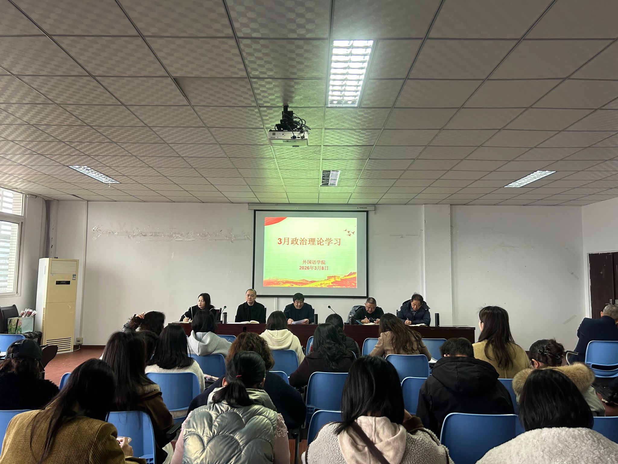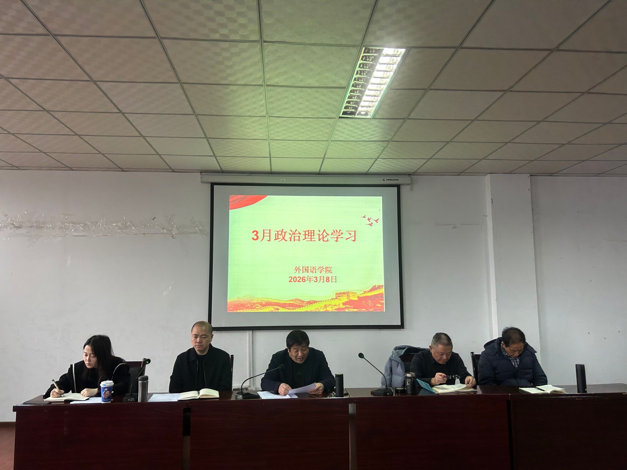 2026 年 3 月 8 日,OK138太阳集团在明辨楼 1-604 召开3 月教职工政治理论学习会。学院党总支书记甘长银领学,全体教职工参加学习。