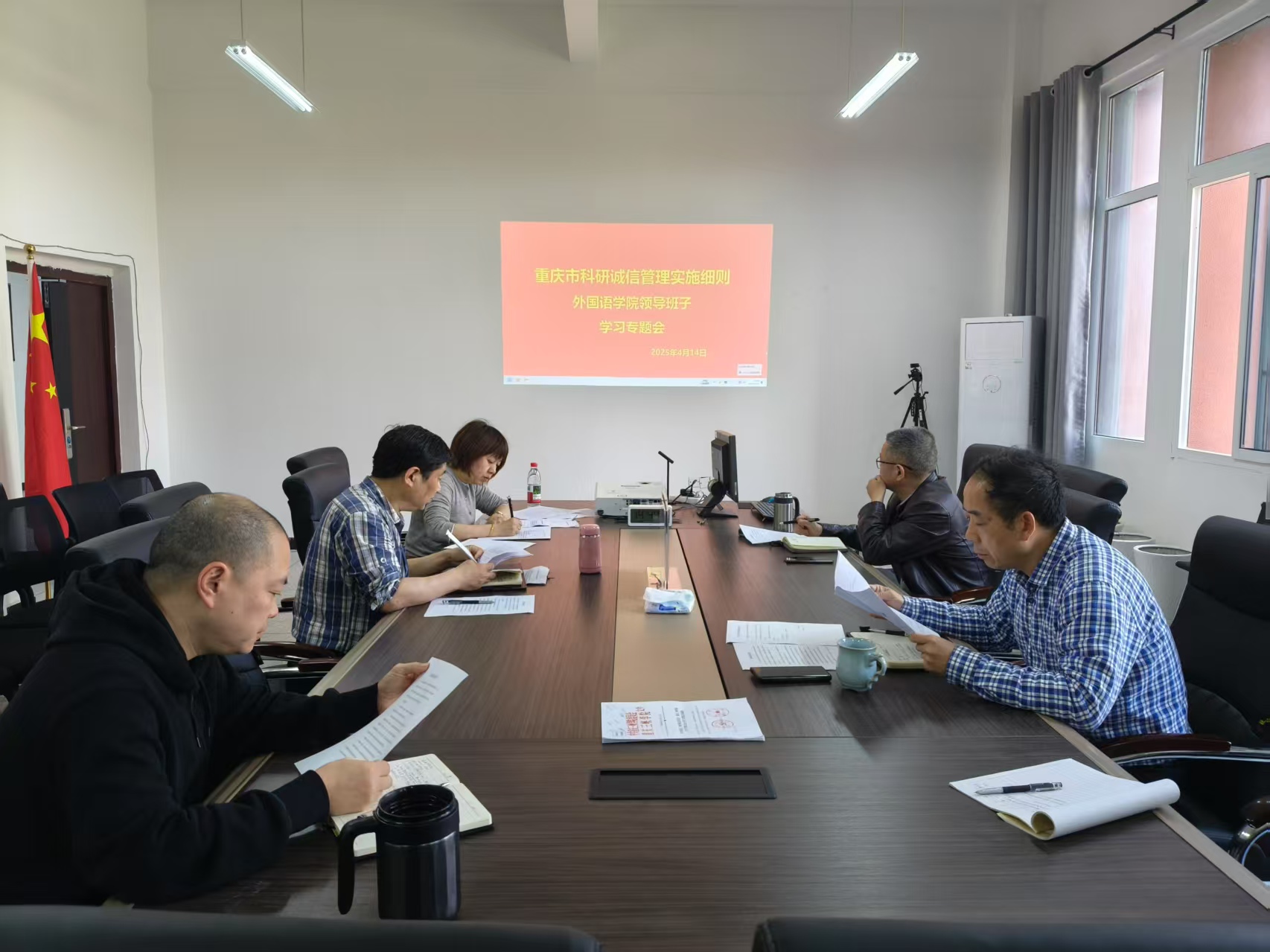 学院分管科研工作的副院长唐淑华教授领学了《重庆市科研诚信管理实施细则》,重点解读了科研诚信管理范围、科研诚信计分管理、计分结果运用等内容。班子成员围绕《重庆市科研诚信管理实施细则》要求,结合学院科研工作实际展开讨论,提出完善制度建设、加强宣传教育、强化监督管理、深化自查自纠等重点工作方向。会议决定本周四(4月17日)下午召开全体教职工大会,集体学习上述细则精神,并签订科研诚信承诺书,以此启动今年的科研诚信教育。