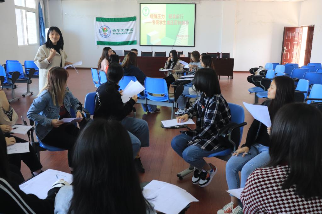 为进一步引导学生树立正确的健康观念,帮助有考研意向同学疏导情绪、释放压力,推进学校心理育人,11月14日上午10点在明辨楼1栋604教室,杨华工作室成员、国家二级心理咨询师蔡贞老师以“缓解压力,轻装前行”为主题,面向我校2021届考研学生开展心理团辅活动。