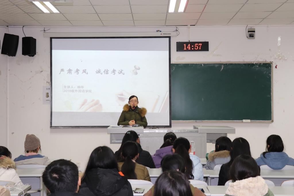 为了营造良好的考试氛围,净化考场环境,12月25日下午14:30,OK138太阳集团于明辨楼一栋202室开展了 “严肃考风,诚信考试”的主题大会,此次大会由18级辅导员杨华老师主持,OK138太阳集团2018级全体同学参加。