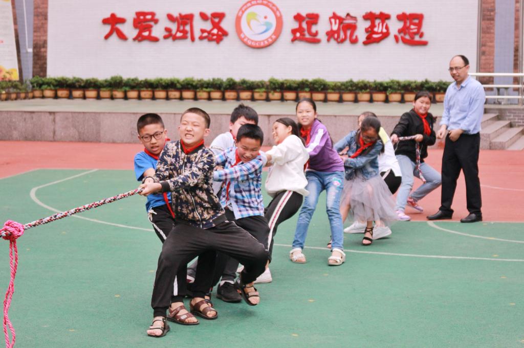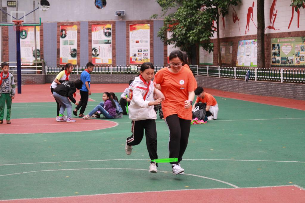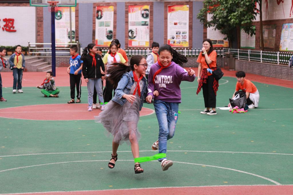 同时,在操场,学生干部们带领赶场小学的孩子们开展了“拥抱阳光,筑梦启航”主题户外活动。