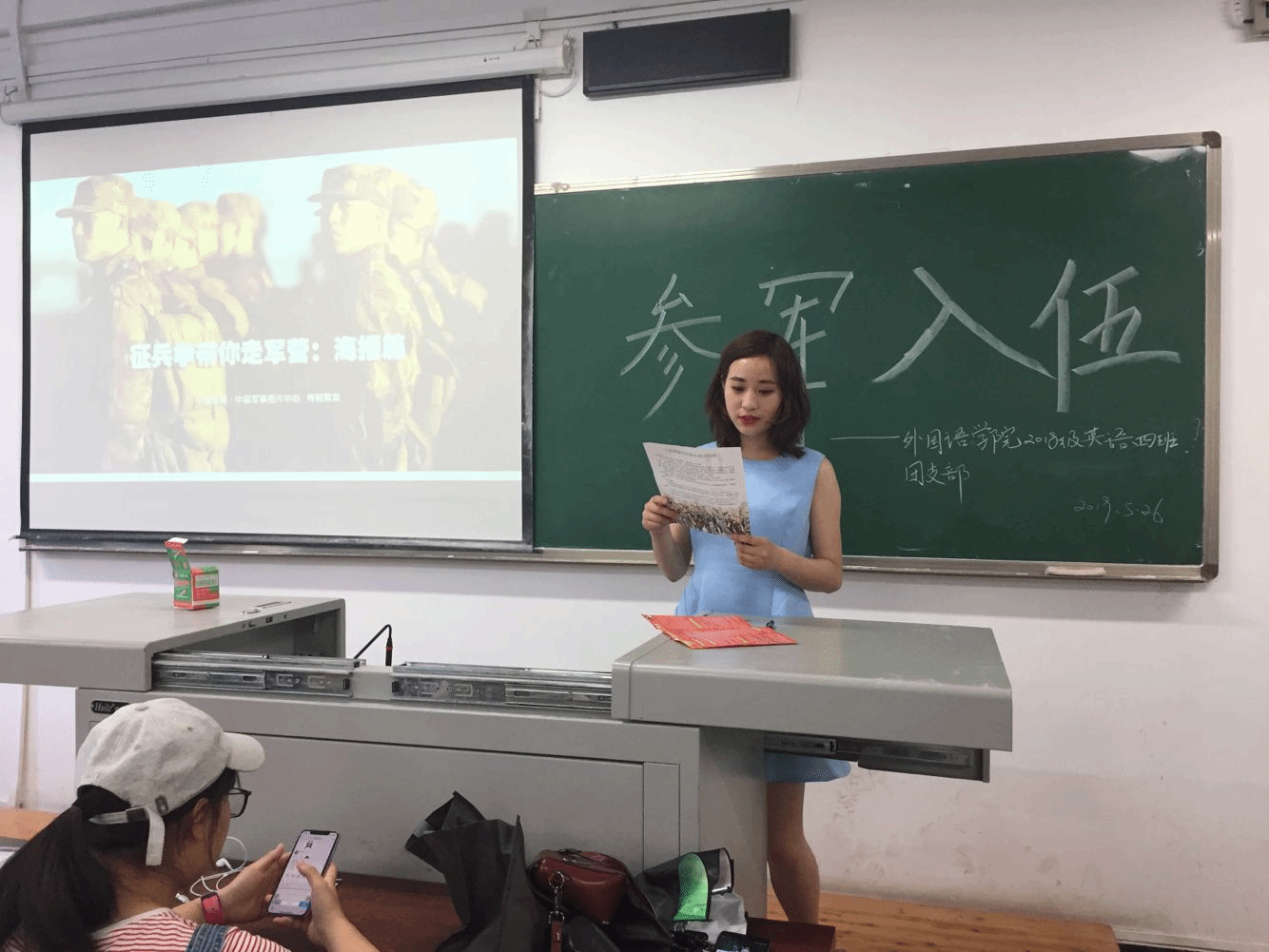 会上,各班班委首先分享了军人作战以及生活的一系列图片,加深了同学们对军营生活的认识;接着各班班委结合征兵志愿宣传手册,向同学们认真讲解了征兵优惠政策以及征兵标准,提高同学们入伍参军的积极性,帮助学生树立端正的理想信念;最后,通过观看大学生入伍宣传片,使有意愿参军的同学们更加详细的了解到了征兵工作的具体内容和细节。