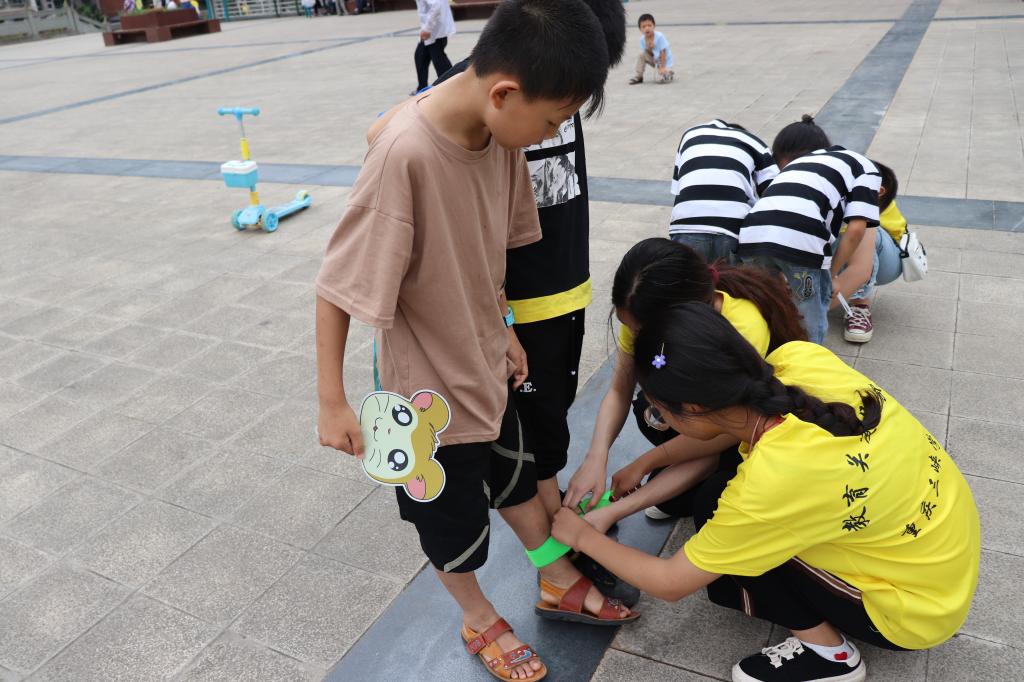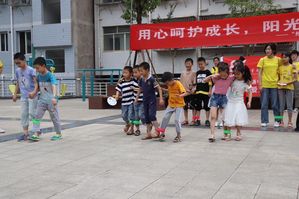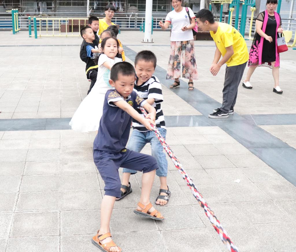 细风吹拂,天气正好。广场中间的拔河绳,瞬间点燃了孩子们的热情。他们卯足力气,喊着整齐的“一二一二”声,对比赛的专注与热情洋溢在他们稚嫩的脸上。紧接着,服务团成员开始带着孩子们进行两人三足游戏。绑脚绳并没有给孩子们带来太多的烦恼,尽管磕磕绊绊,他们也丝毫热情不减。摔倒了爬起来,调整好再出发,跨过终点线的那一刻,孩子们都露出了灿烂的笑容。活动期间,每个小朋友都积极参与,齐心协力,面对比赛带来的困难与紧张气氛毫不畏惧。欢呼声、呐喊声不绝于耳,振奋人心的掌声也让孩子们更有信心和激情完成接下来的比赛。在比赛的过程中,孩子们也明白了团结和互相信任的意义。