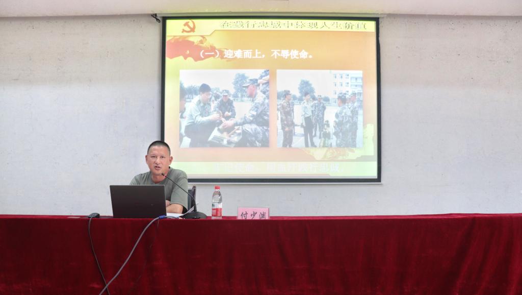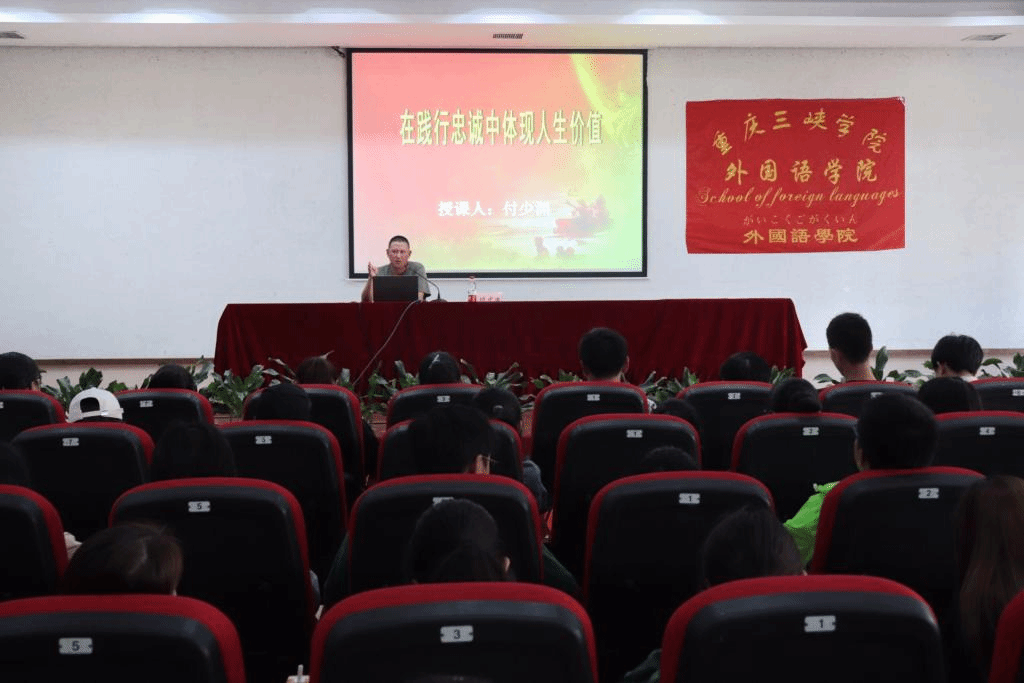 付少渊同志曾是部队某营营长,有着20年丰富的军旅生涯和光辉成绩。曾参加“98长江抗洪”、“4.20庐山抗震救灾”、“10.28万州公交车坠江救助”等多项重大任务,多次立功受奖,尽到了一名军人的光荣职责。他以自身成长的经历为例,用朴实的语言讲述一个个扣人心弦的故事,传达一个个耐人寻味的真理,向同学们诠释了如何用实际行动践行忠诚,在服务国家、服务社会、服务人民中去体现人生的价值。“国家兴亡,匹夫有责”,付营长激励同学们增长才干,奋力前行,初心始终不忘,使命牢牢在肩,积极参军入伍,报效祖国,把忠诚融入生命。