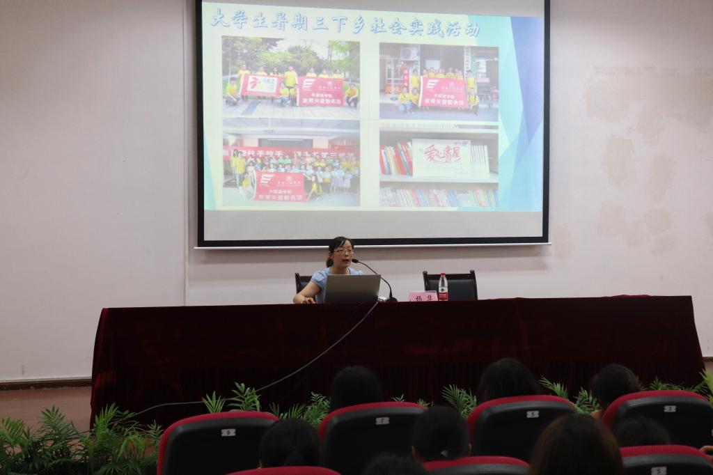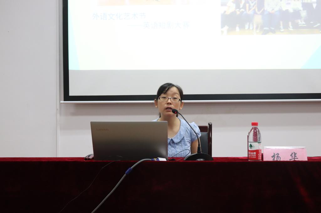 杨华老师依次向同学们介绍了外语文化艺术节、大学生暑期三下乡社会实践活动、社区志愿者服务和网络宣传建设等活动。这些活动又被称为大学生的第二、三、四课堂。首先,杨华老师向大家介绍了大学生第二课堂,包括英语短剧大赛、英语写作大赛、外文卡拉OK大赛、英语课堂风采大赛、团支部风采大赛、迎新晚会等一系列活动,旨在全面提升学生综合素质,树立广大同学成长、成才的信心。随后,杨华老师展示了大学生暑期三下乡社会实践活动、社会志愿者服务活动和暑期社会实践活动的精彩瞬间,使同学们对丰富多彩的大学生第三课堂有了更加直观的认识。最后,杨华老师希望新生积极参与社会实践,展现当代学生的社会担当,做知行合一的大学生。