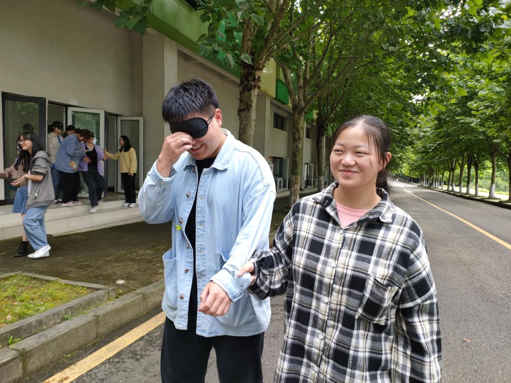 本次心理团辅以心理游戏的方式开展。首先,第一个活动“你好,新朋友”。罗老师让大家坐成一圈,通过彼此自我介绍,让大家互相认识,同时认识自我,让大家放平一开始紧张、胆怯的心态,以更平和的心态去进行接下来的活动。接着,第二个活动“心有千千结”。通过手牵手和小组讨论的方式让大家回顾自己在过去和现在的人际交往中,是否遇到过一些心结,是如何解决的?或者还未解决的,打算怎么办?这项活动让同学们感受到了在人际交往时遇到困难很正常,我们要做的就是发表自己的所见所听,积极沟通,将自己的想法说出来让对方理解。最后,第三个活动“你是我的眼”。此项活动分两轮开展,第一轮想象自己是一个盲人,期待一位具有什么特质的伙伴当自己的眼睛,写出其中三个特质并分享。第二轮两人一组,一人带上眼罩由另一人带领,越过障碍物到达终点,期间交换角色。最后分享自己所理解的人际交往中的人际信任和人际边界问题。此项活动是让同学们明白:每个人的成功都离不开朋友的帮助,一个真正的好朋友能使你少走弯路,是学习与事业上的好帮手。