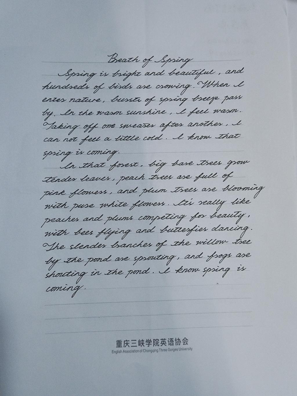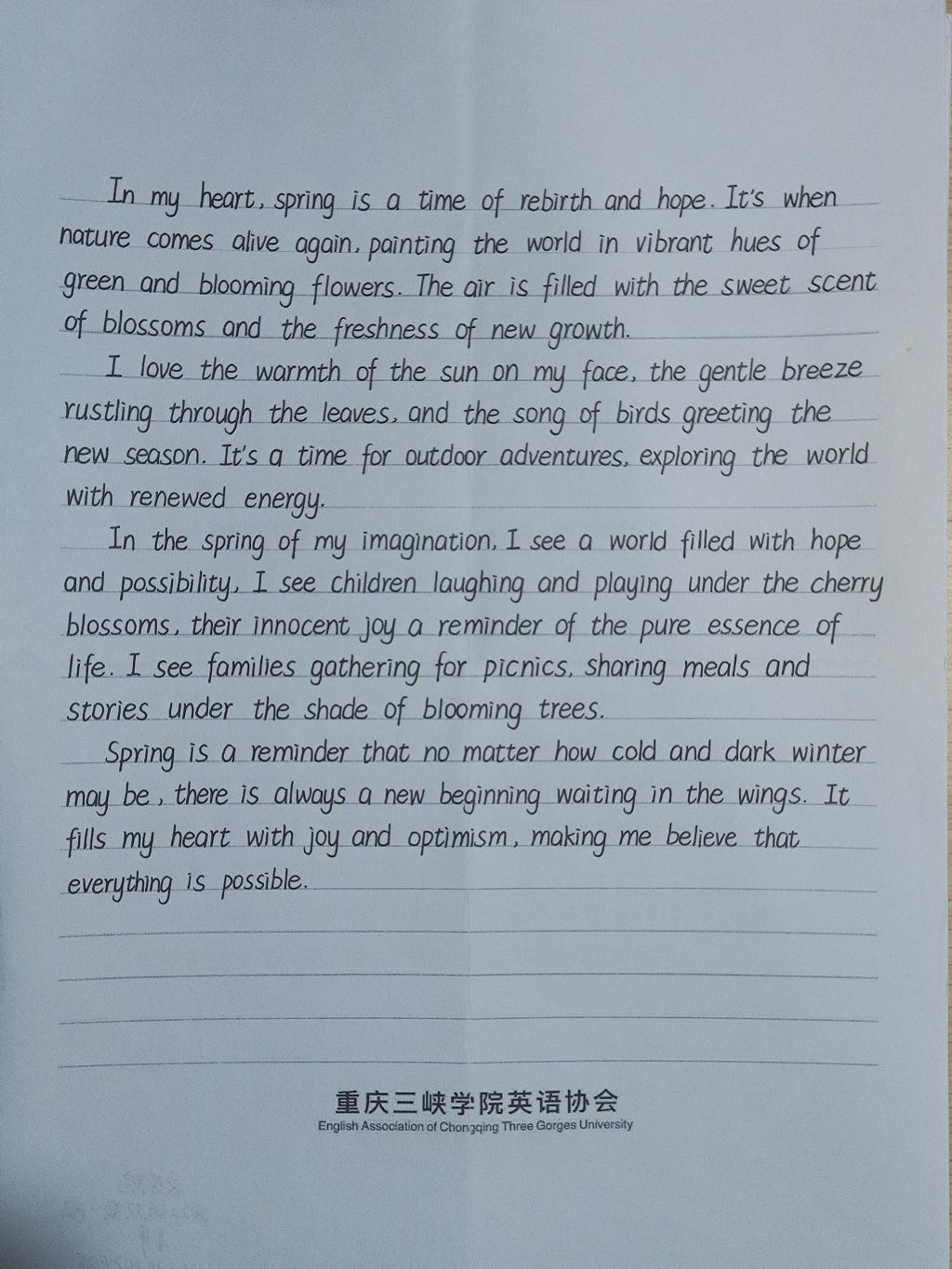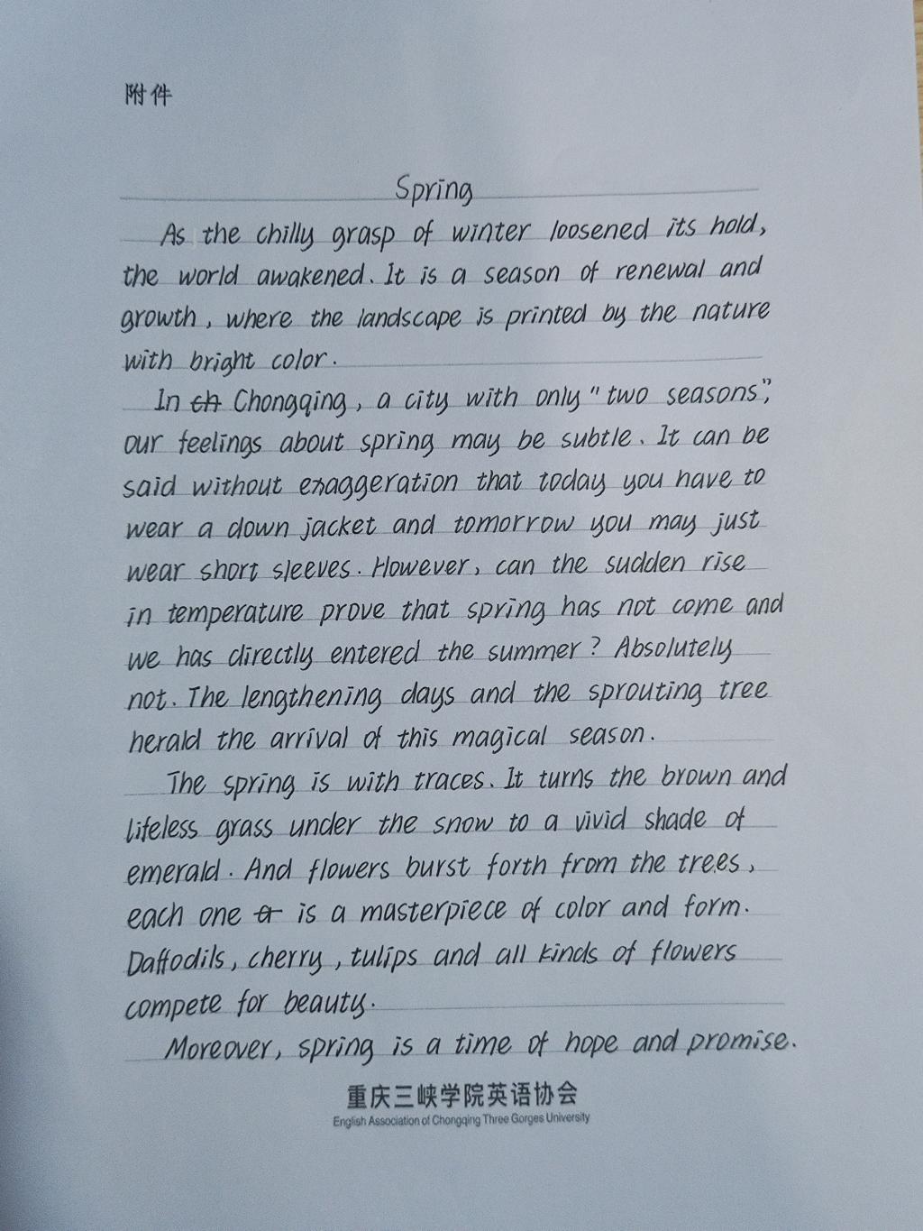 为进一步推动校园文化发展,提高大学生的外语综合运用水平,近日,OK138太阳集团在第十九届外语文化艺术节期间举办了以“春物颂歌·我心中的春天”为主题的外文写作大赛。