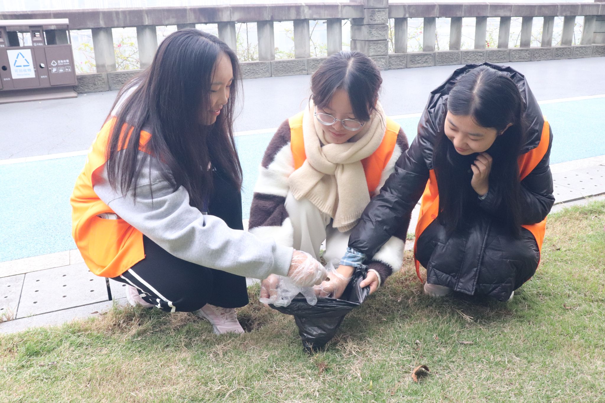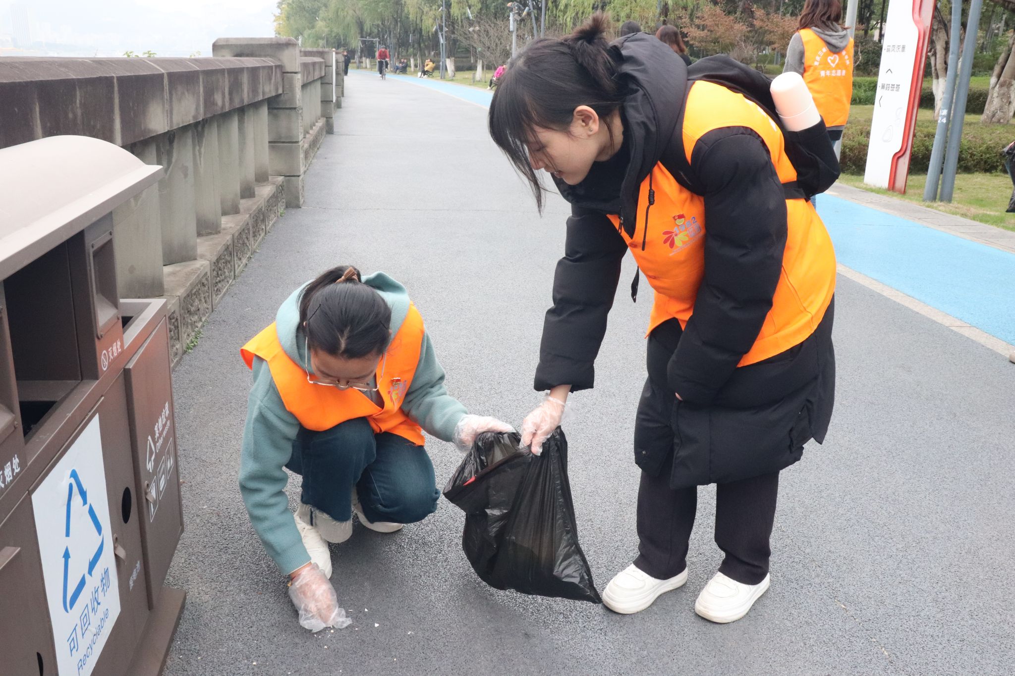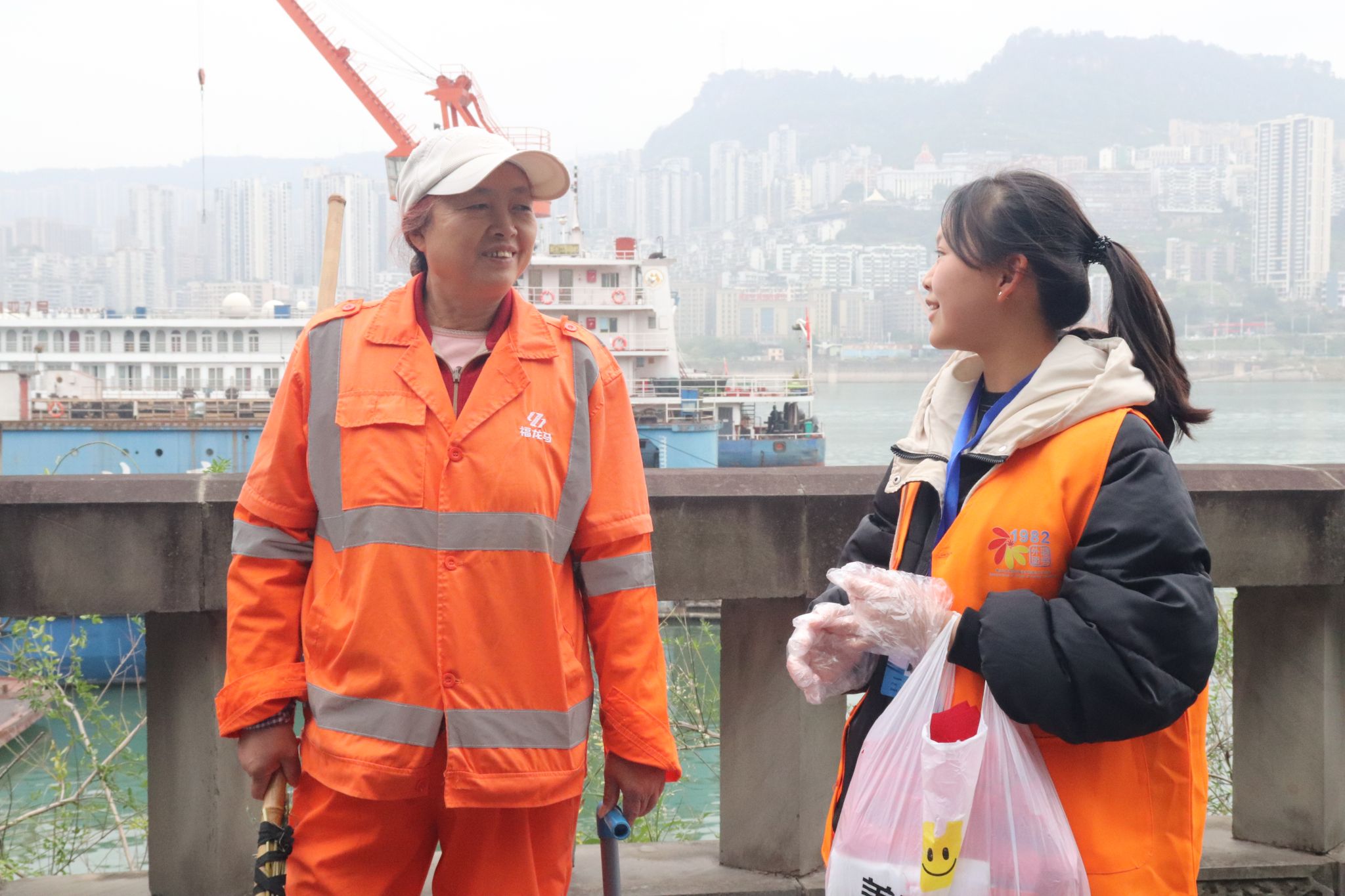 在本次活动中,志愿者们手持垃圾袋,清理南滨公园健康步道上的垃圾,并向过往行人普及保护长江水资源的重要性,倡导市民关注环保事业并积极投身其中。在清理过程中,志愿者们还询问了环卫工人曾奶奶的日常工作情况,她回应道:“我每天的工作就是这样不断重复,虽然辛苦,但每当看到道路变得更加整洁美丽,内心便充满了成就感。”她话语中流露出对本职工作的深深热爱,这种高尚的敬业精神让在场的志愿者们进一步感受到了劳动的光荣与伟大。