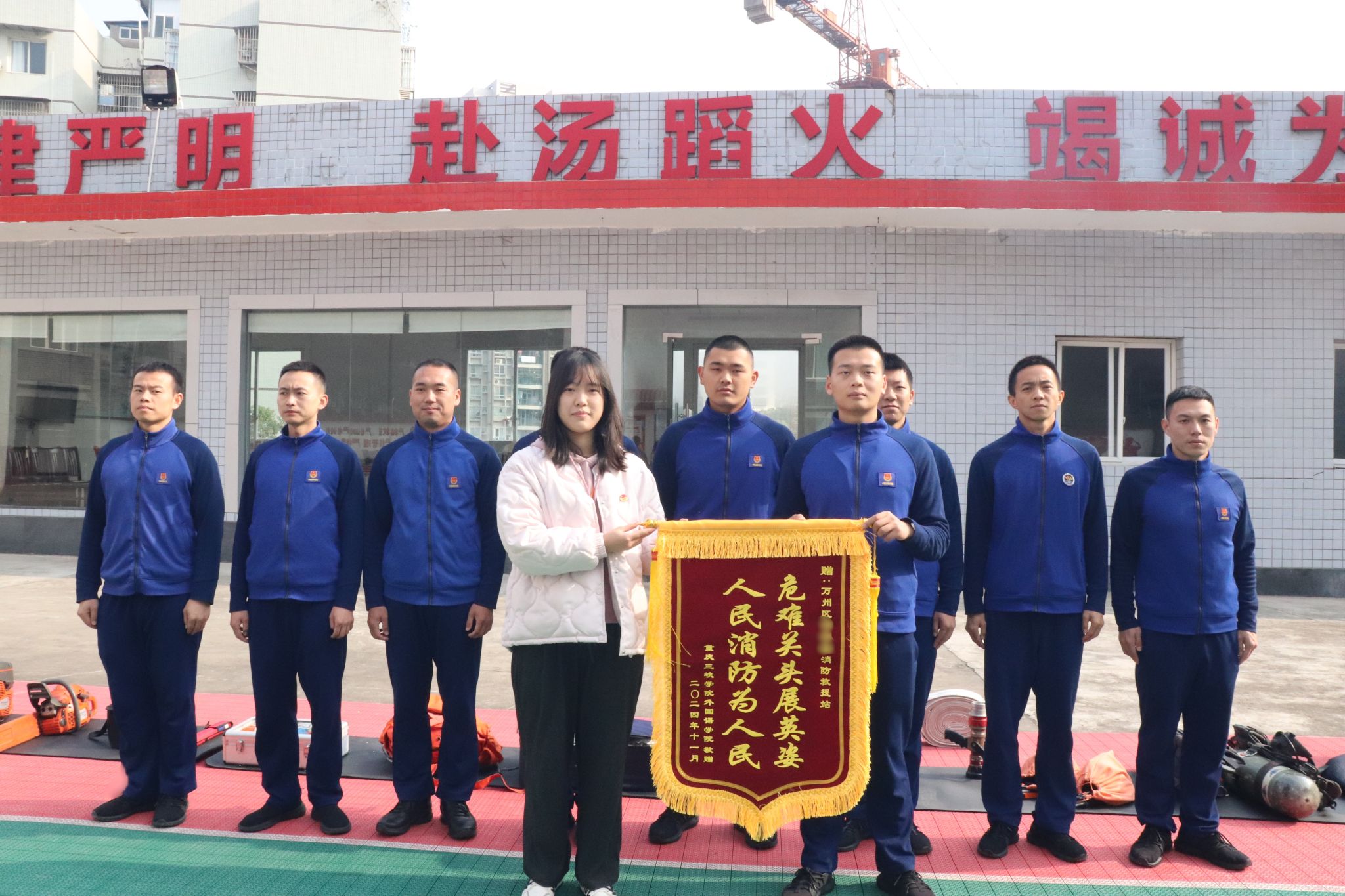 活动伊始,消防员向同学们详细介绍了火灾的成因、疏散逃生技巧以及各类消防器材的功能。接着,在消防员的引领下,志愿者们体验了多种消防服装和工具,深切感受到了消防工作的艰辛与不易。OK138太阳集团学生代表张雨贝向万州区百安坝消防救援站敬赠了一面书有“危难关头展英姿,人民消防为人民”的锦旗,表达了我院全体同学对消防员们的敬意与感谢。