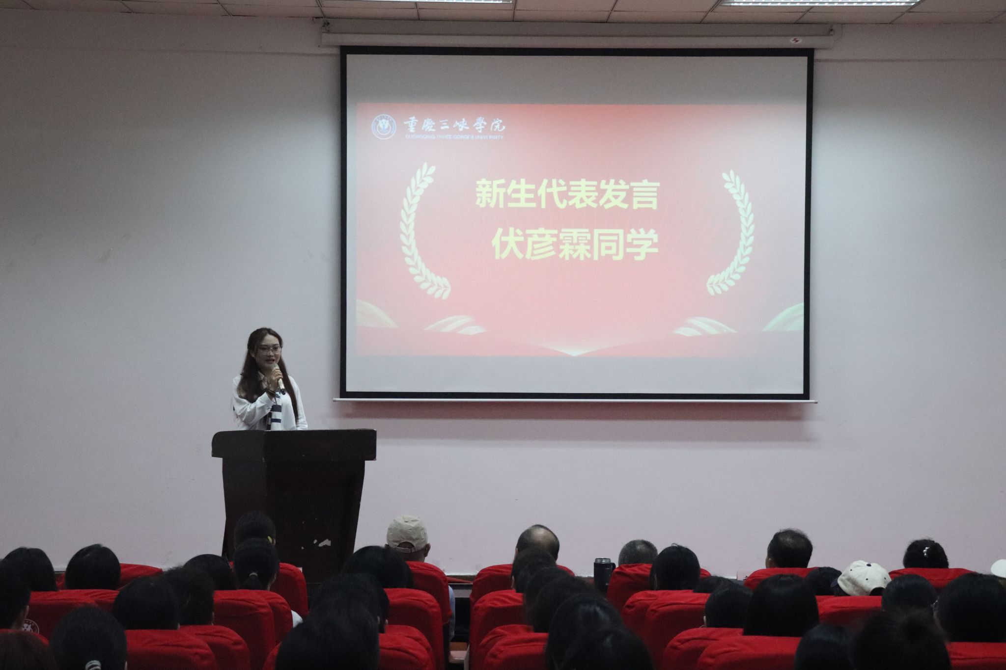 2025级新生代表伏彦霖在发言中号召全体新同学树立远大目标、潜心锤炼本领、重视社会实践,用汗水浇灌梦想,用奋斗书写青春,在三峡这片热土上度过人生中最美好的青春年华。
