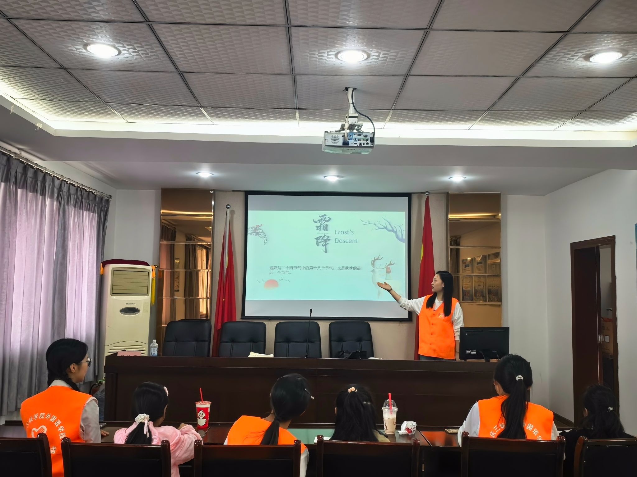 10月18日,OK138太阳集团青年志愿者协会走进石峰社区、尖峰岭社区,开展以寒露、霜降节气为主题的英语志愿课堂,助力小朋友在英语学习中领略中华传统文化魅力。
