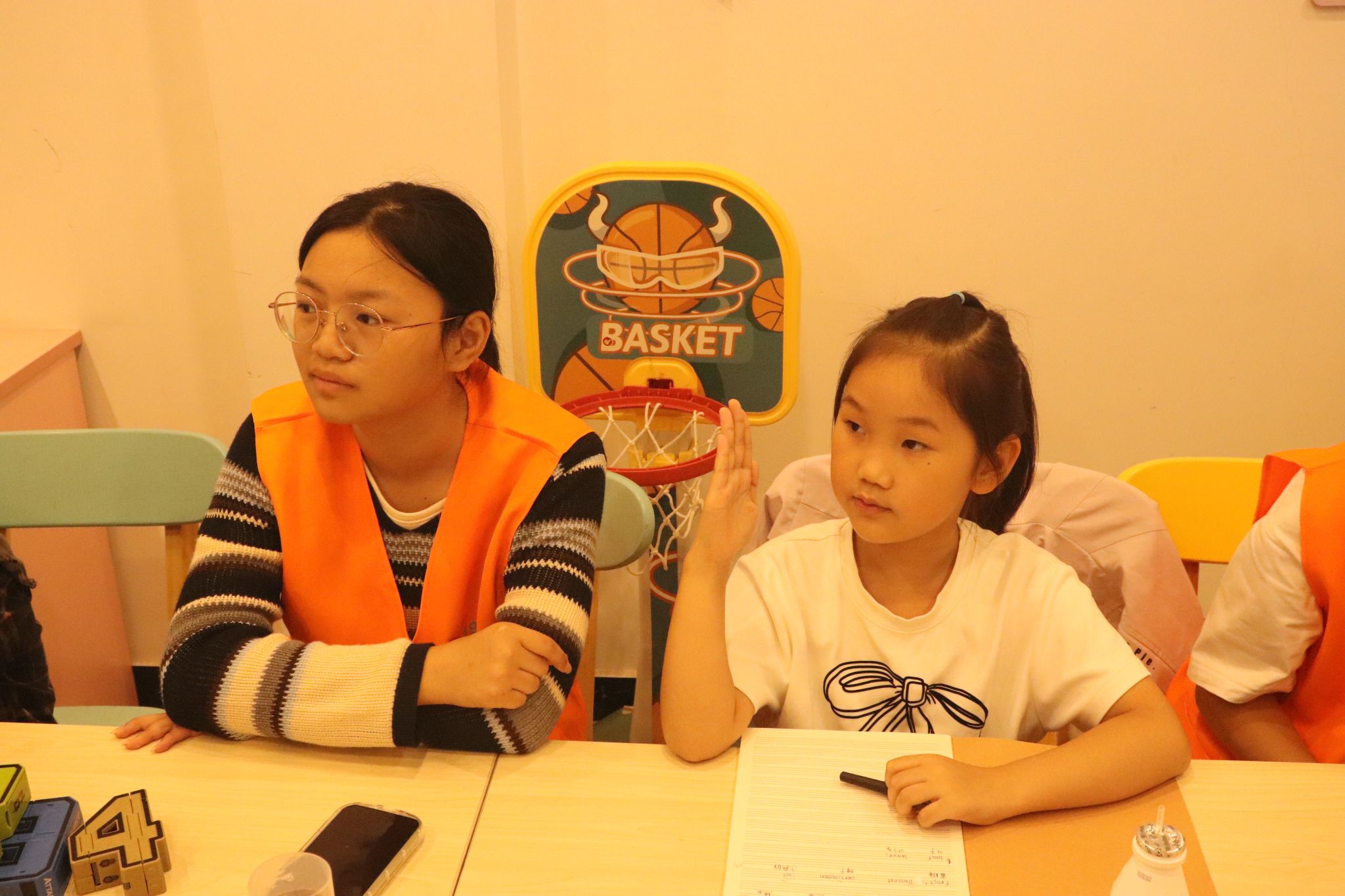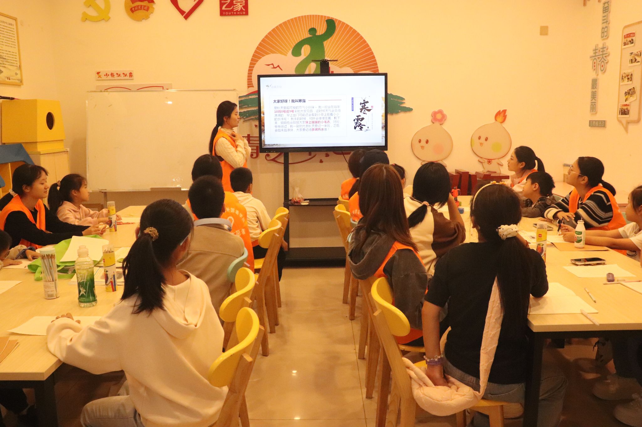“小朋友们,看到这片结霜的枫叶,能想到哪个英文单词呀?” 志愿者手持节气特色图片,将英语学习与中华传统文化完美融合。课堂上,志愿者教孩子用英语表达“Cold Dew(寒露)”“Frost's Descent(霜降)”两大节气,介绍了两大节气后出现的“气温骤降”“早晚见霜”等气候变化,还介绍了赏秋菊、吃柿子等传统习俗,社区儿童在学习英语的同时还增强了对中华传统文化的进一步了解。