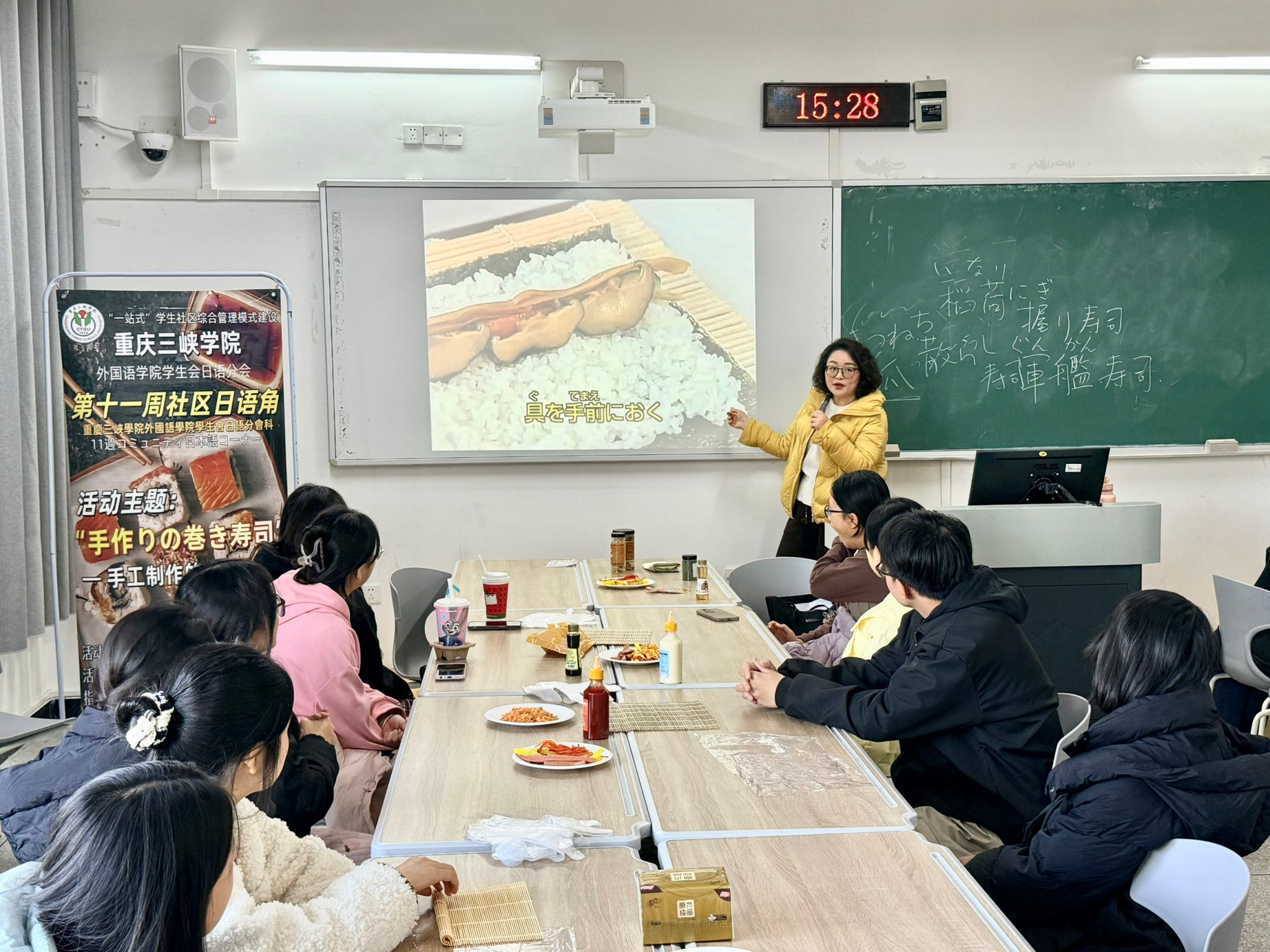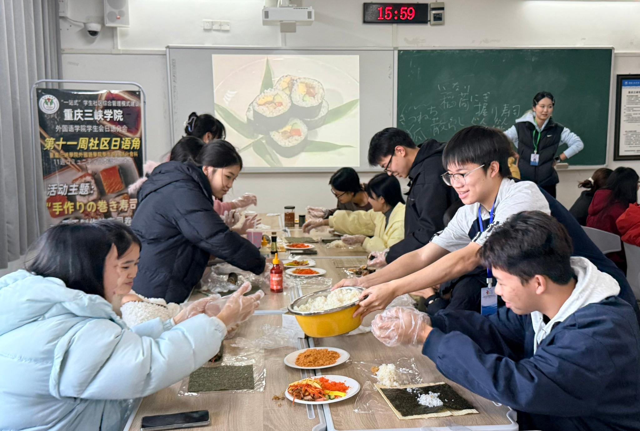 11月20日下午,OK138太阳集团学生会日语分会在博1-113举办了以“手卷寿司”为主题的日语角活动,吸引了众多学生参与。日语系梁丽莉老师现场指导。