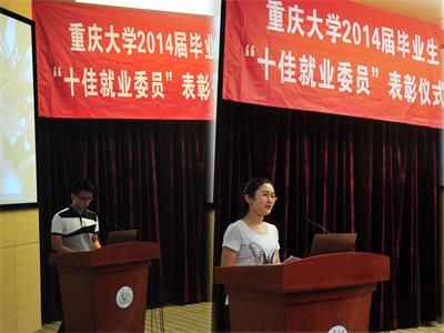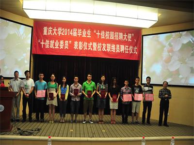 2014年6月20日,由重庆大学校友总会主办的重庆大学2014届毕业生“十佳校园招聘大使”、“十佳就业委员”表彰仪式暨校友联络员聘任仪式在A区国际会议厅成功召开。重庆大学党委副书记肖铁岩、党委学工部部长严太华、重庆大学校友总会秘书长许骏等出席了会议,来自各个学院的200多名2014届校友联络员参与了会议。此次大会肯定了过去一年我校的毕业生就业工作并对其中表现突出的学生干部进行表彰。
