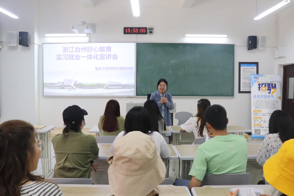 4月29日14:20,浙江台州舒心教育有限公司招聘人员到我校博学楼1栋206针对英语专业大三、大四学生召开实习就业专场宣讲会。