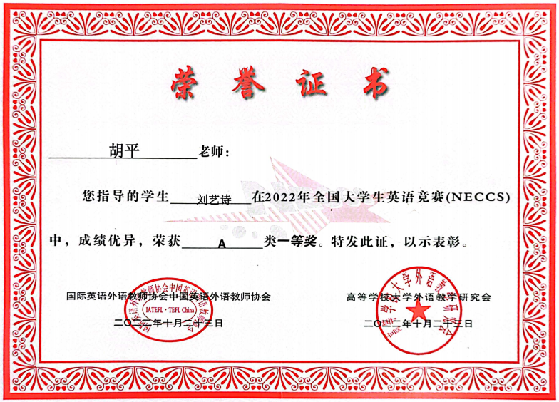 我院胡平老师指导的学生刘艺诗在2022年全国大学生英语竞赛(NECCS)中,成绩优异,荣获A类一等奖.我院向此表示热烈的祝贺!