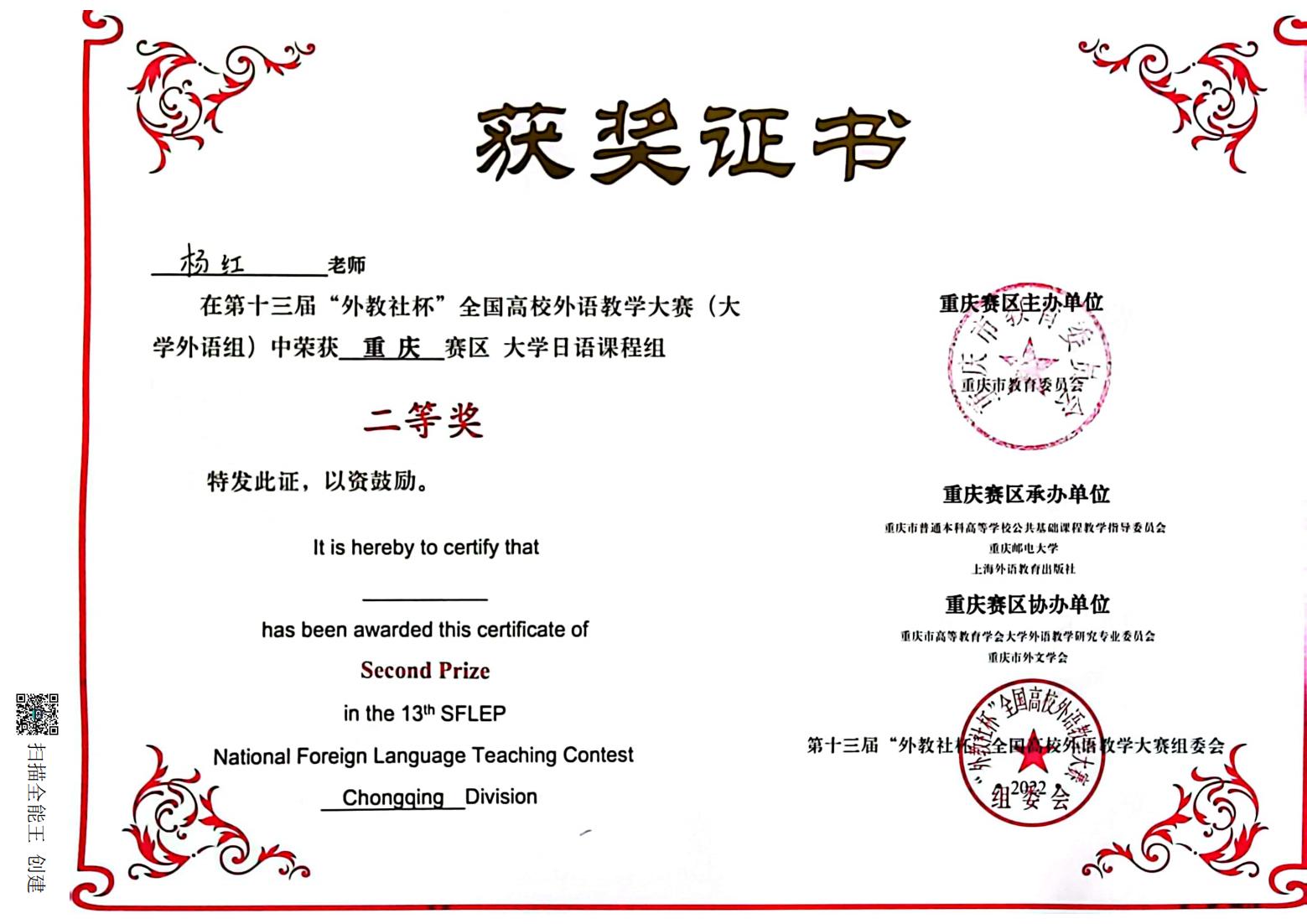 我院杨红老师在第十三届“外教社杯”全国高校外语教学大赛(大学外语组)中荣获重庆赛区大学日语课程组二等奖。我院向此表示热烈的祝贺!