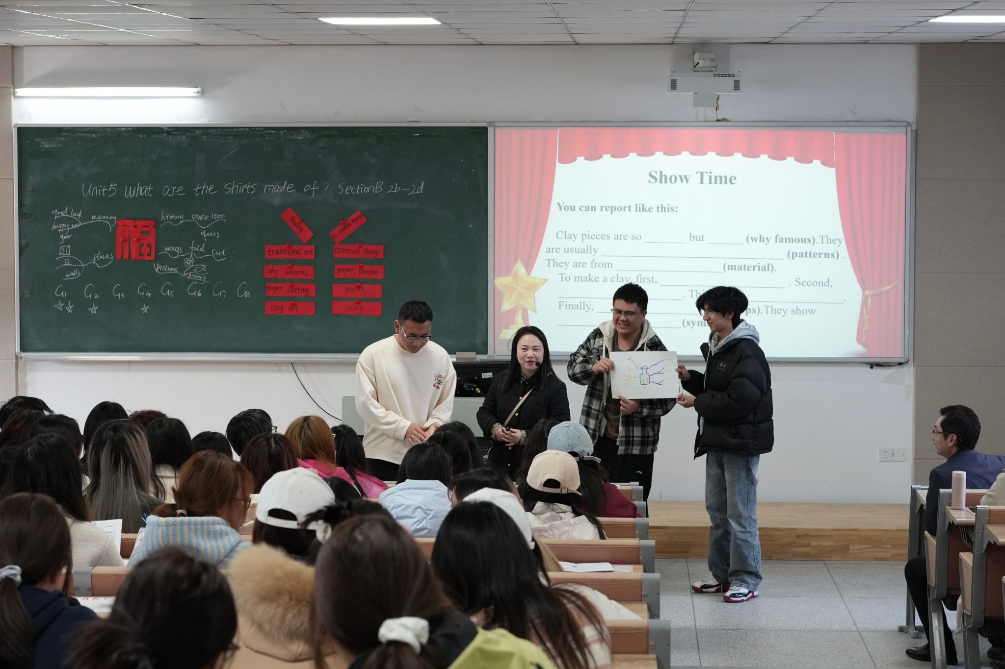 唐华老师以人教版九年级上册Unit5 What are the shirts made of? Section B 2a-2d为课例,围绕“中国传统艺术”主题展开教学。课程以一段生动展现中国剪纸、陶艺等传统艺术的视频导入,通过“预测-速读-细读-读后讨论”四步教学法,引导学生深入探究孔明灯、剪纸、泥塑的文化内涵。课堂上,唐老师通过组织小组合作绘制思维导图、引导学生复述制作流程、开展头脑风暴讨论艺术传承意义等多样化活动,充分调动学生参与热情。学生积极互动,课堂气氛活跃,尤其在“如何用英语推广传统艺术”的讨论中,各组观点碰撞激烈,充分体现了“以学生为主体”的教学理念。