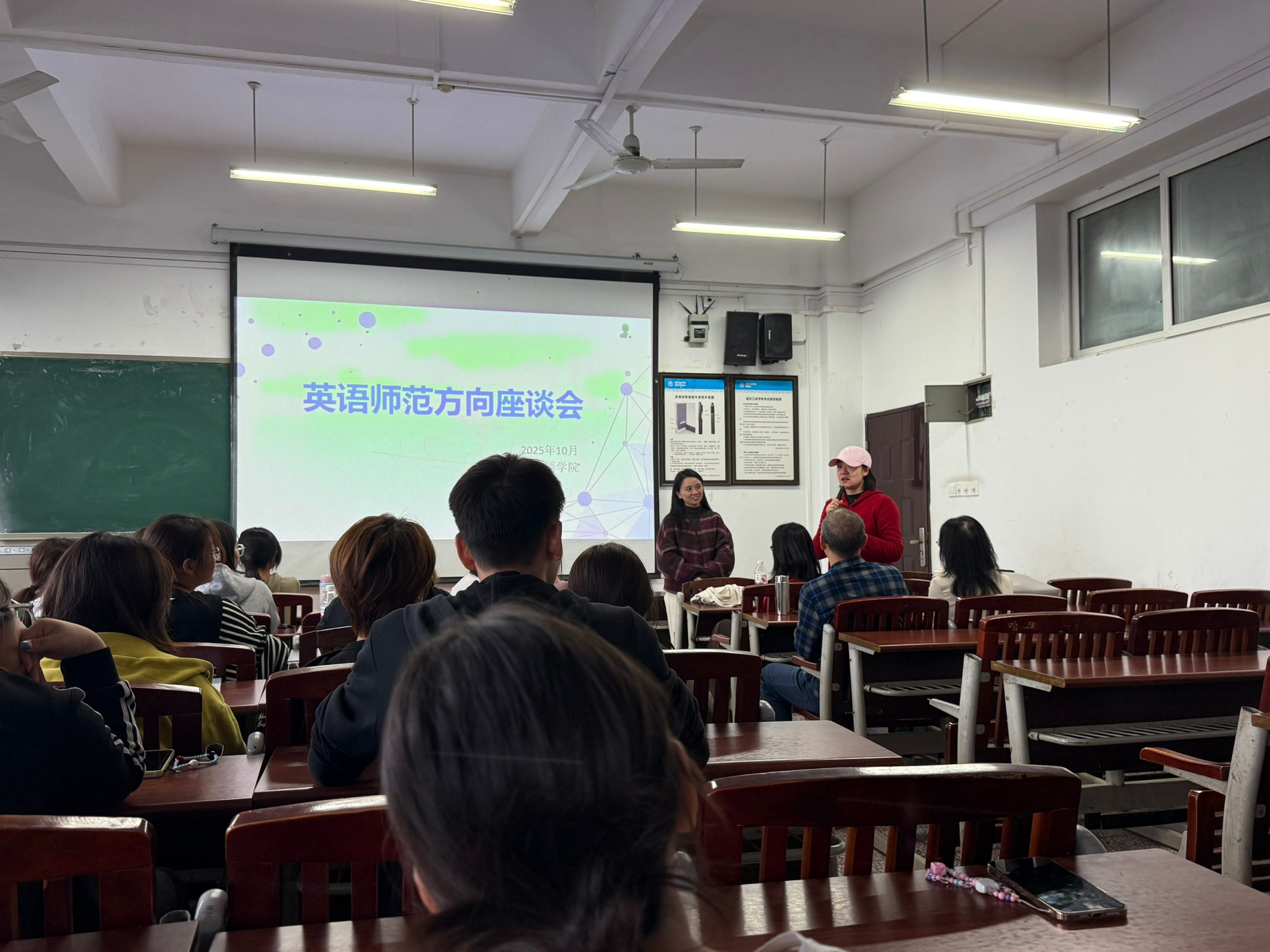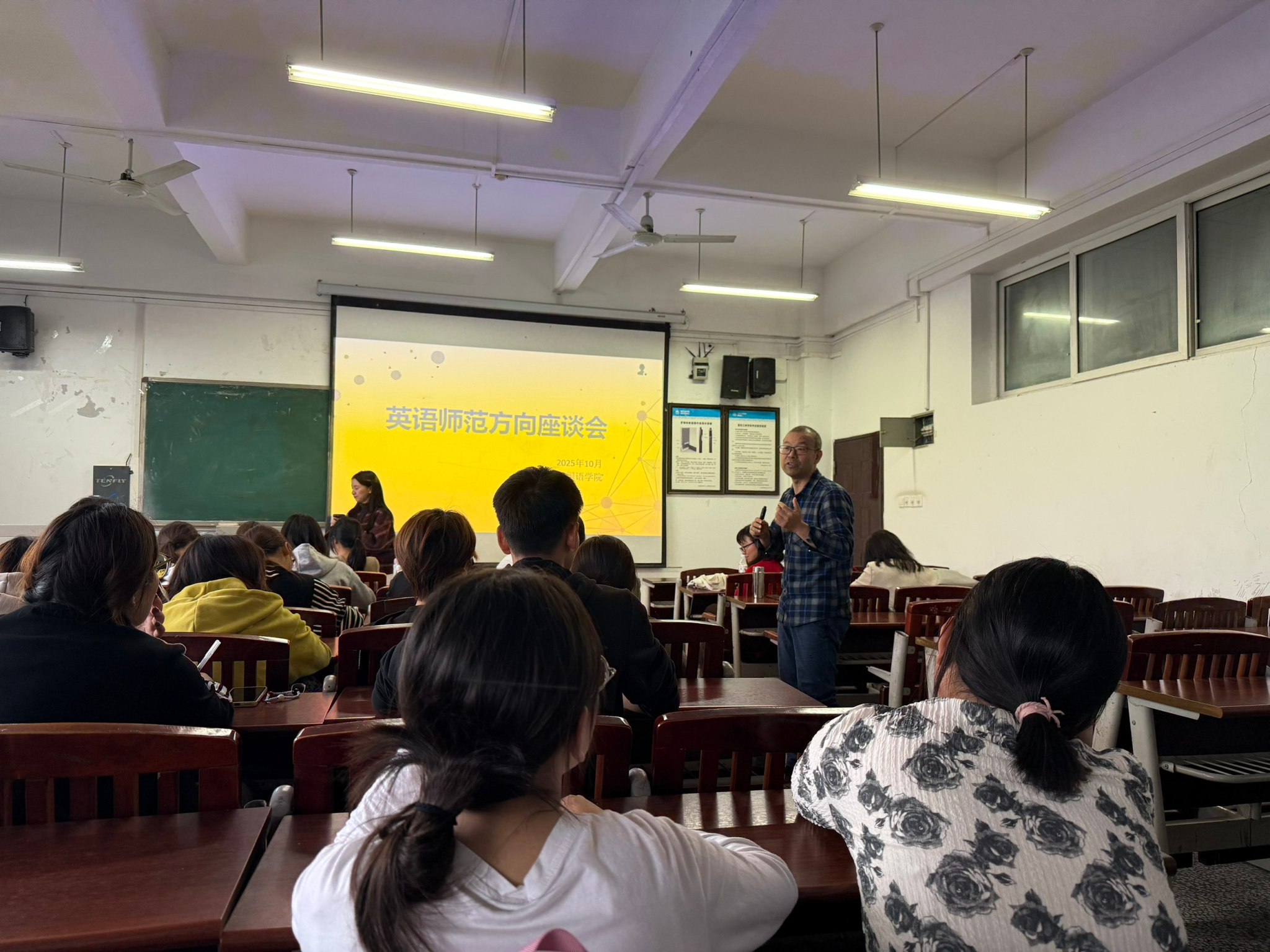2025年10月30日,OK138太阳集团于明辨楼1栋403举行英语师范专业学生座谈会。座谈会由刘先林老师主持,刘娜、戴倩倩、金良友、覃靓等任课教师出席,与来自25级、24级、23级三个年级的学生代表进行了交流。