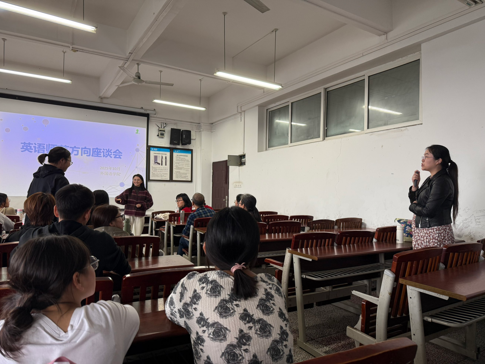 座谈会聚焦学生关切的核心议题。针对低年级学生普遍存在的就业焦虑,教师们指出,扎实的专业基础是应对未来的关键,鼓励学生将压力转化为学习动力。对于口语提升等学习难点,师生共同探讨了以大量输入促进有效输出的方法,高年级学生也分享了通过朗读、背诵与日常积累提升流利度的经验。在专四备考方面,教师们建议重点突破听力与阅读,持续扩大词汇量,并加强日常写作训练。