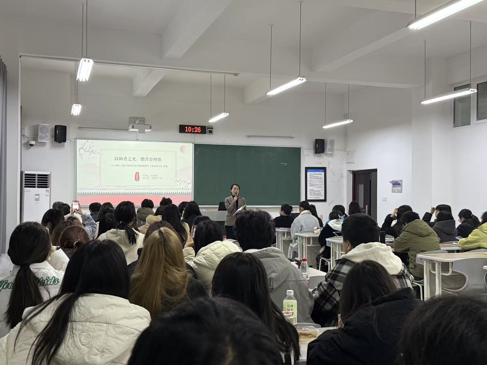 11月19日,我院在博学楼1栋206教室为2023级英语师范专业学生举办《教育研习》之师德体验专题讲座。本次讲座特邀重庆市英语骨干教师、万州区新田中学高级教师沃雯秋担任主讲人,2023级全体英语师范生到场聆听。讲座由许楠主持。