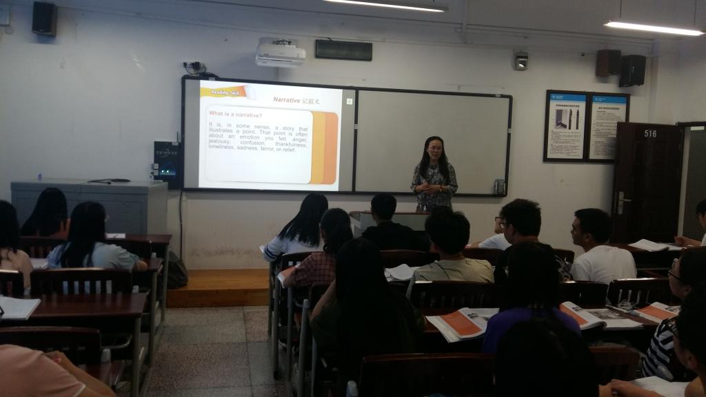 2019年4月24日(第9周)周3第3节,余建琼老师在明辨楼1栋516举行了公开课,余老师以《新视野大学英语2(读写)》Unit 4 Section A College Sweethearts为题,从大学生恋爱这一话题引导学生进入课堂内容,有效调动课堂氛围;从课文宏观结构入手,结合记叙文涉及的具体要素,带领学生积极参与文章的精读过程,并解答问题。