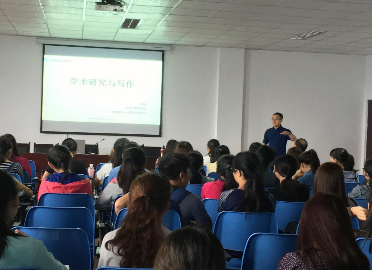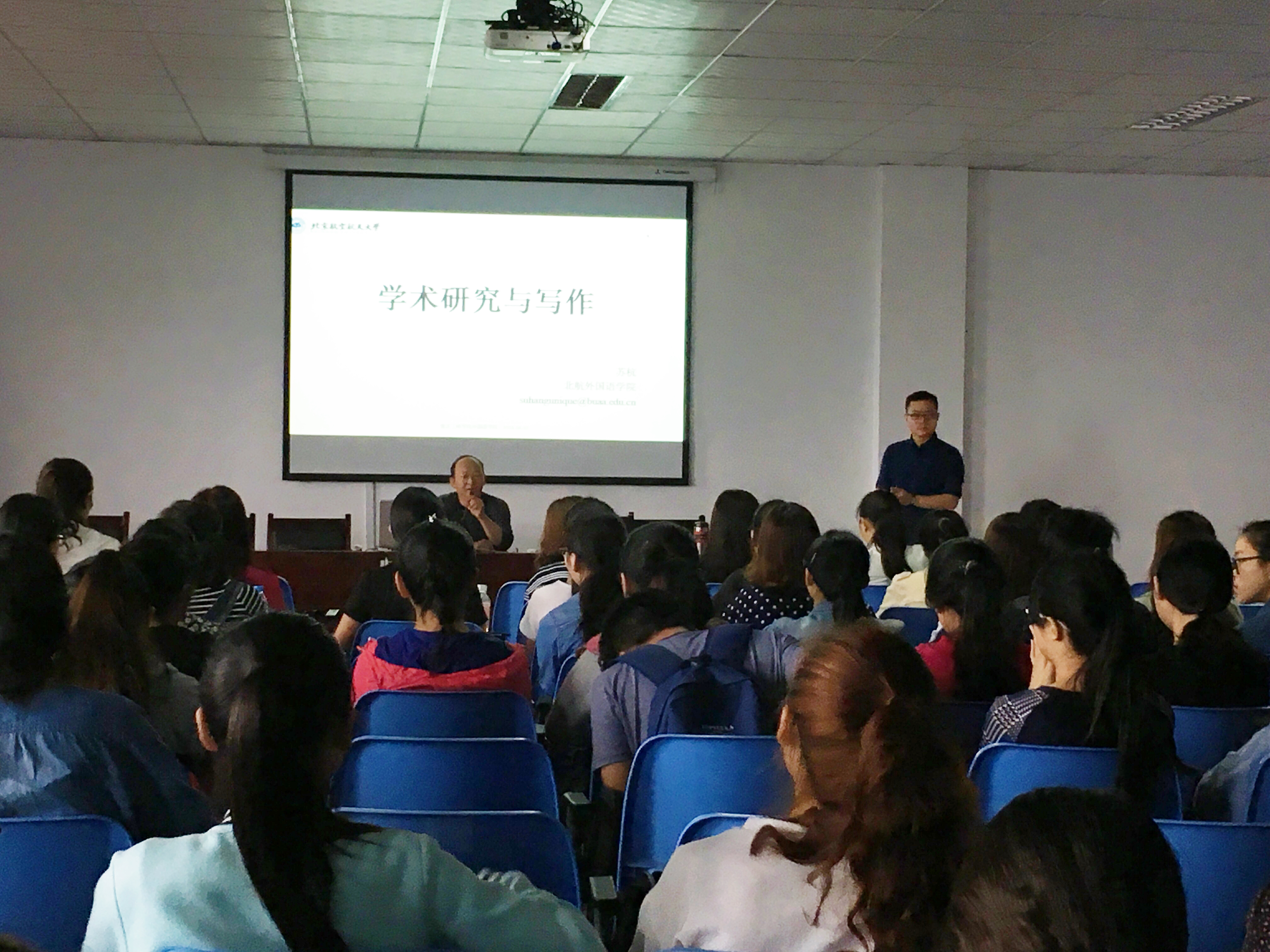 2016年6月2下午2点30分,研究生“外语教育论坛”学术活动组邀请了我校OK138太阳集团优秀校友、英国伯明翰大学博士、北京航空航天大学博士苏杭先生在新区1教604为OK138太阳集团全体硕士研究生、研究生导师、研究生课程教师、青年教师代表以及部分大二、大三本科生作了题为“学术研究与写作”的专题讲座。OK138太阳集团院长王扬教授主持了本次专题讲座。