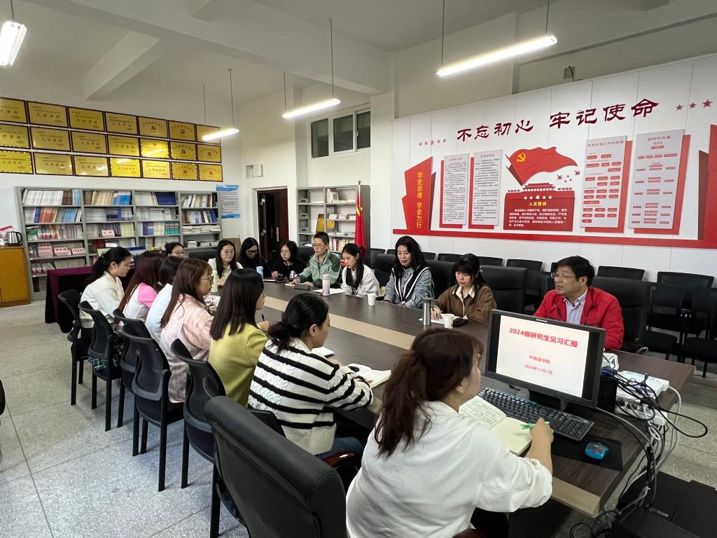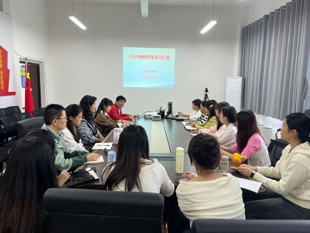 2024 年 11 月 7 日15:30,我院2024级学科教学(英语)研究生在博学楼 3 栋 315 开展了见习汇报。我院党总支书记甘长银主持分享会,研究生导师许楠、夏荥及2024级、2023级研究生参加。