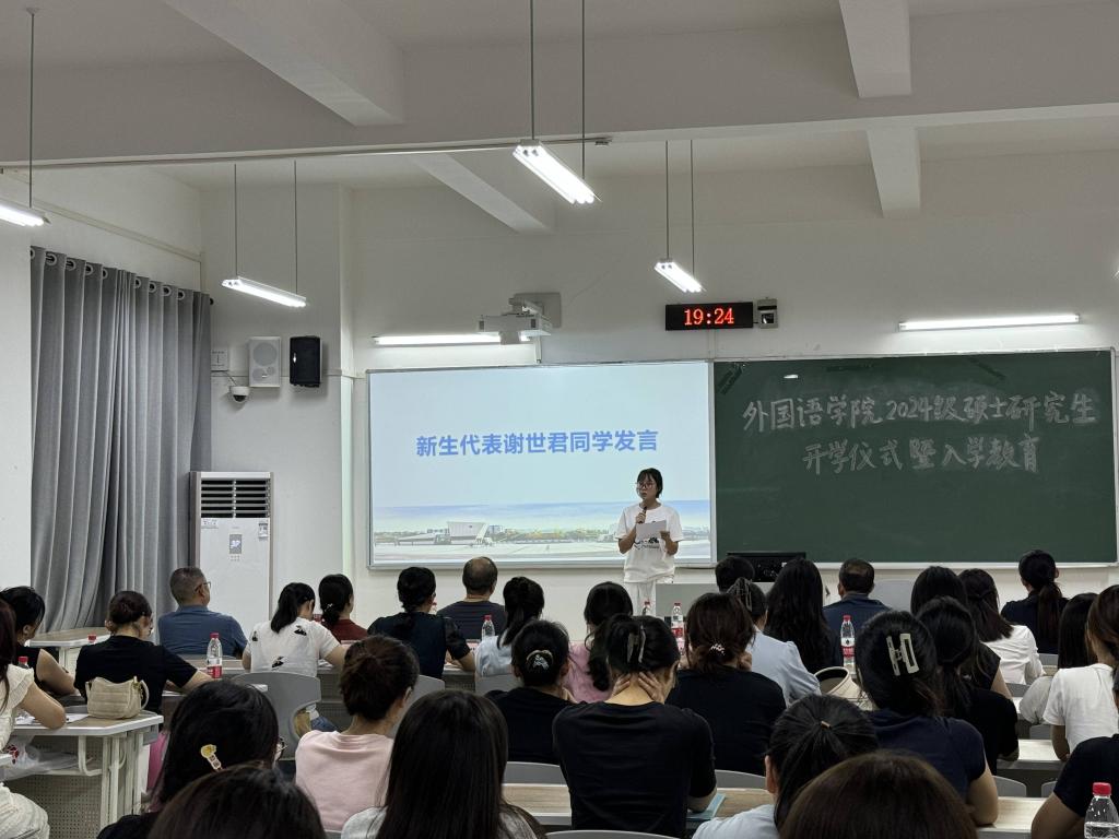24级新生代表谢世君讲述了自己的求学和成长经历,并表示会不断挑战自我,追求卓越,努力学习专业知识,提升专业能力。