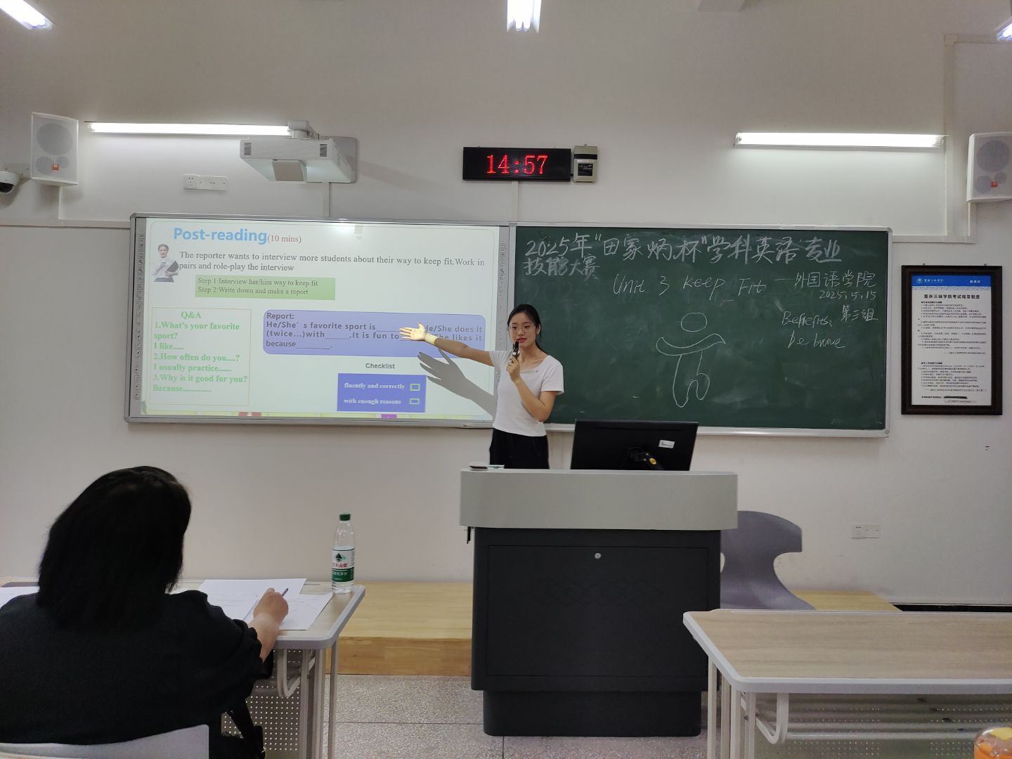 比赛采取现场授课形式进行,竞赛内容为教学设计(含教学课件设计)和模拟教学。其中教学设计占总分的15%,教学课件占总分的15%,教学视频占总分的70%。选手根据自己的教学设计,呈现一节课完整的教学环节(学生活动部分只需布置任务、不留活动时间),10分钟以内,不得超时。经过比拼,冉雪糅、秦榛嘉两位同学获得特等奖;范爽、向秋彤、周啟胜、谢世君、陈兰、陈欣宇获得一等奖。