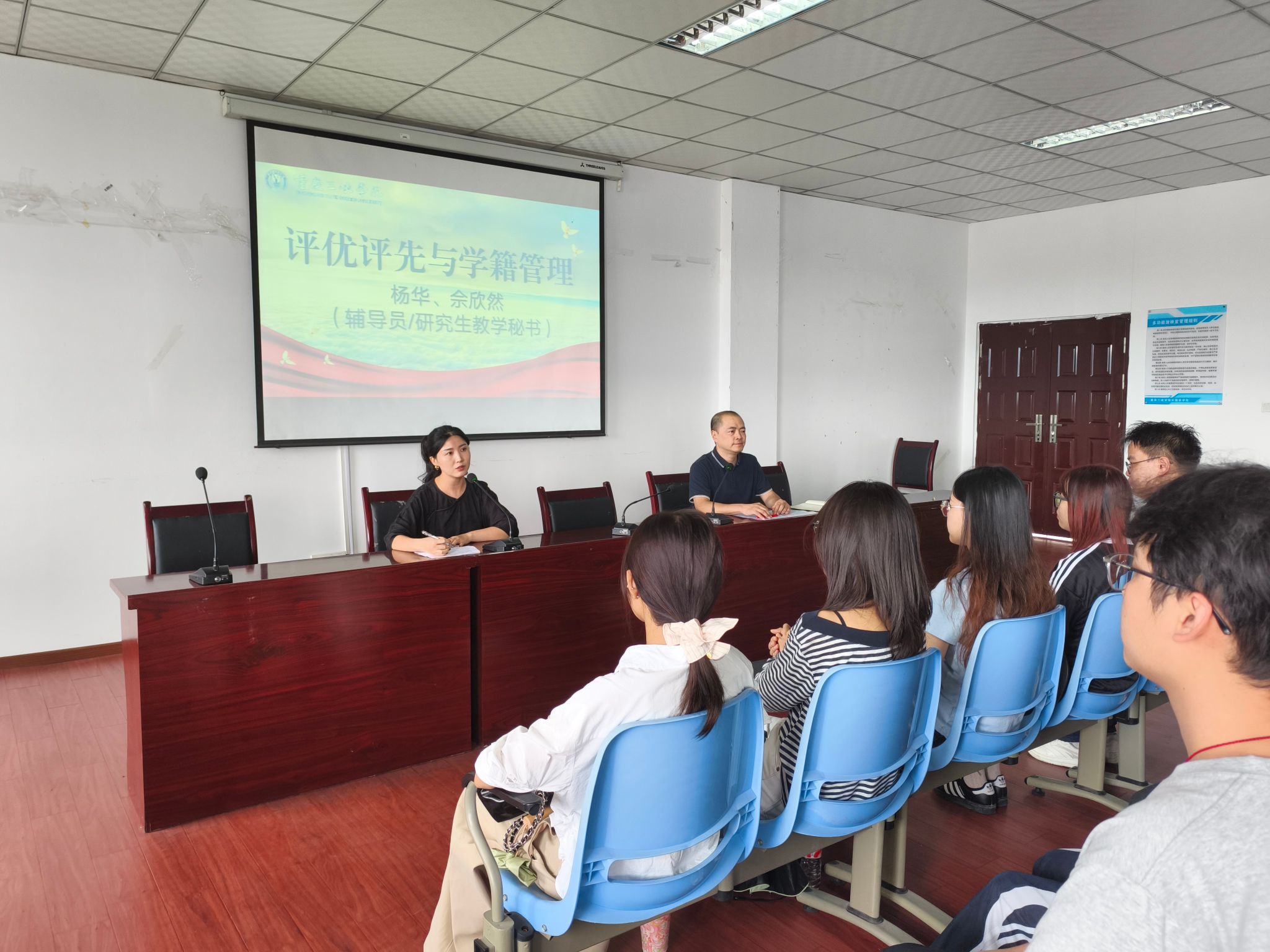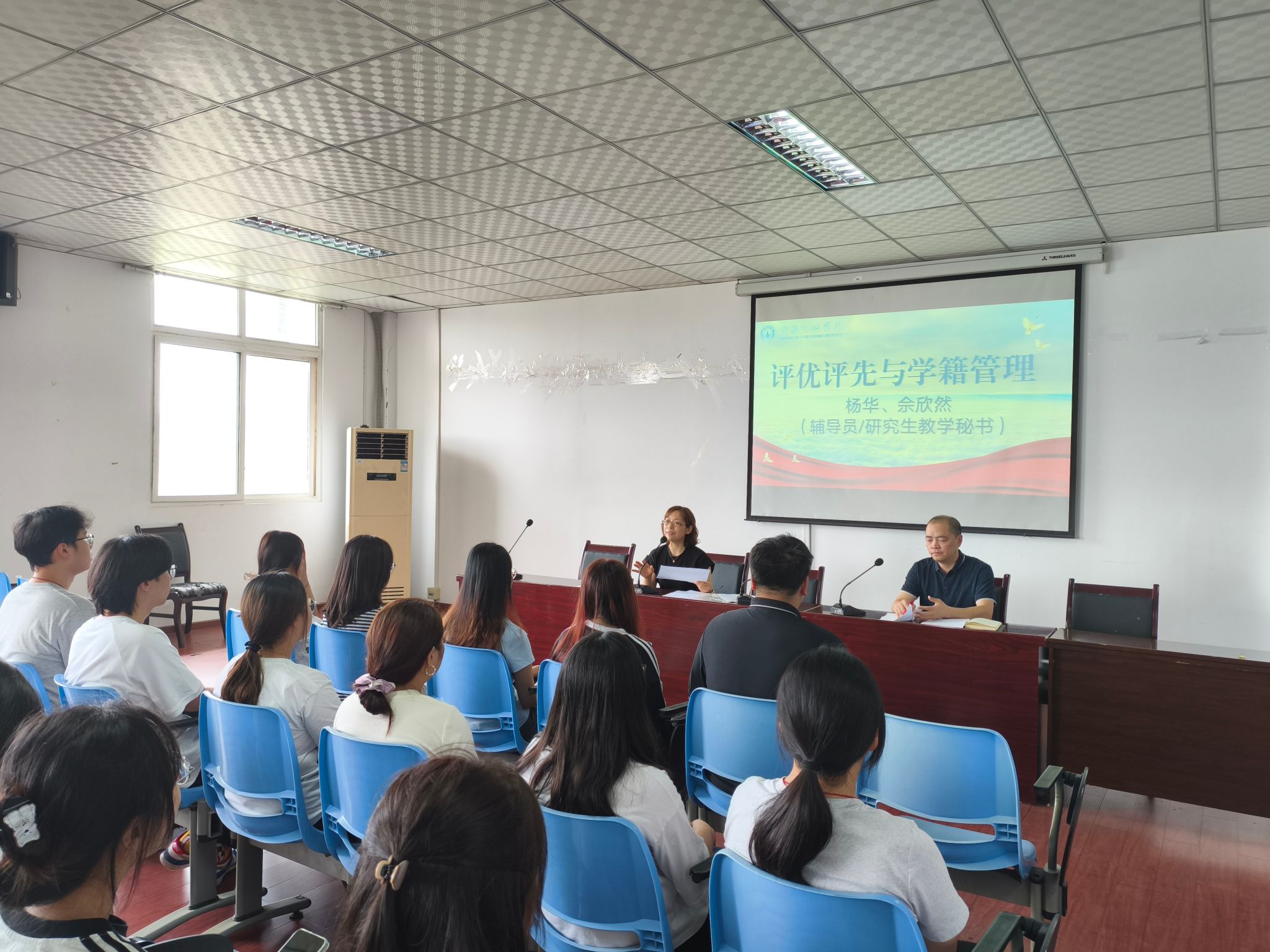 9月11日下午,我院在明辨楼1-604教室面向2025级研究生新生举行评优评先与学籍管理宣讲会。学院辅导员杨华、研究生教学秘书佘欣然担任主讲人。