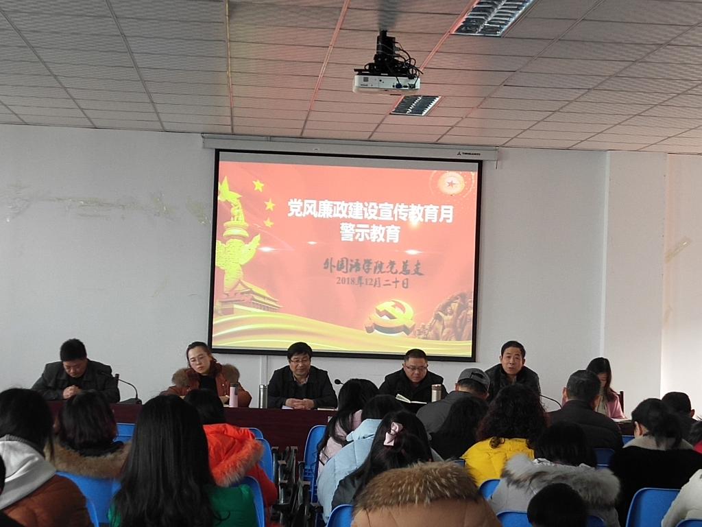 按照学院党总支《关于开展党风廉政建设宣传教育月警示教育活动的方案》布置,外国语将通过多种形式开展党风廉政警示教育。2018年12月20日下午,OK138太阳集团召开全体教职工会议,开展警示教育活动。会议由党总支书记甘长银主持。