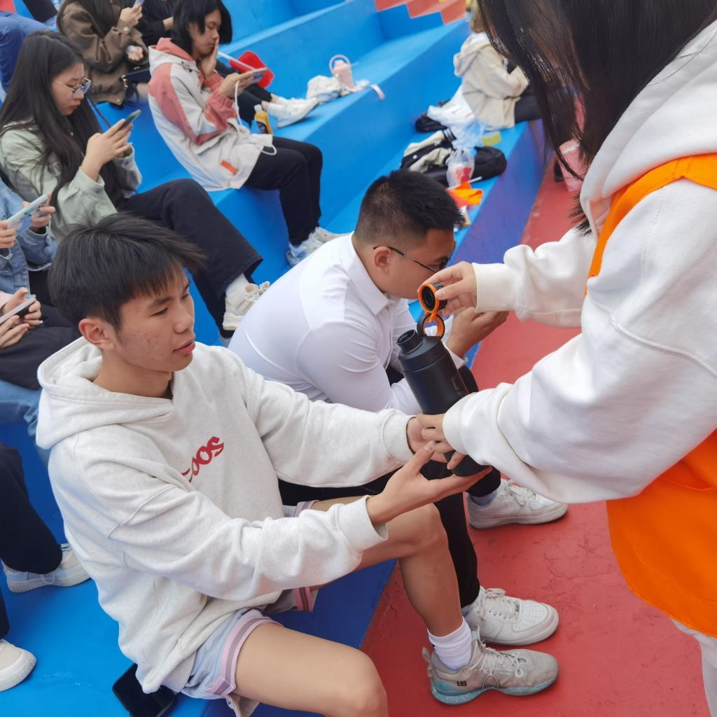 运动会期间,党员志愿者们身着志愿服,清扫看台垃圾、维持观众秩序、为我院运动员加油助威、照顾参赛选手等。不论烈日炎炎,还是春雨绵绵,党员志愿者们始终坚守工作岗位。在服务同学的过程中,他们践行党的宗旨,让竞技场上充满温暖,散发青春活力。