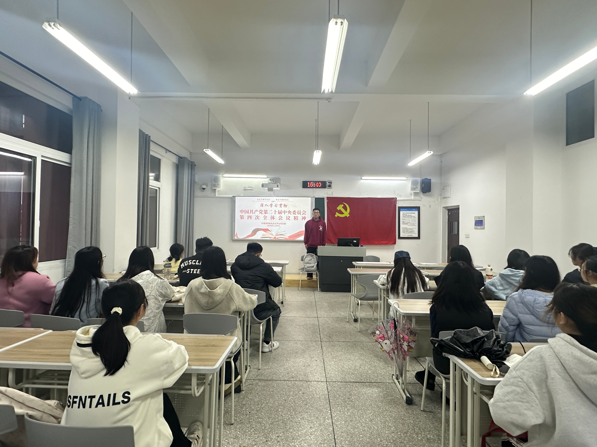 为深入学习贯彻党的二十届四中全会精神,引导青年学生党员准确把握其核心要义与实践要求,11月6日下午,我院四个学生党支部在博学楼1-202联合开展党的二十届四中全会精神专题学习。会议由党员工作站分站长吴成坤主持。
