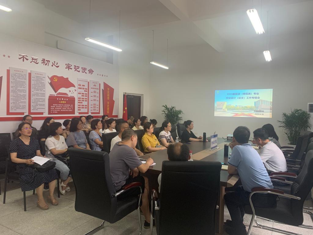 2022年6月16日下午16:00,我院院在博学楼3栋315召开了2023届英语(师范类)专业毕业设计(论文)专题会。全体英语(师范类)毕业设计指导教师参加了此次会议。