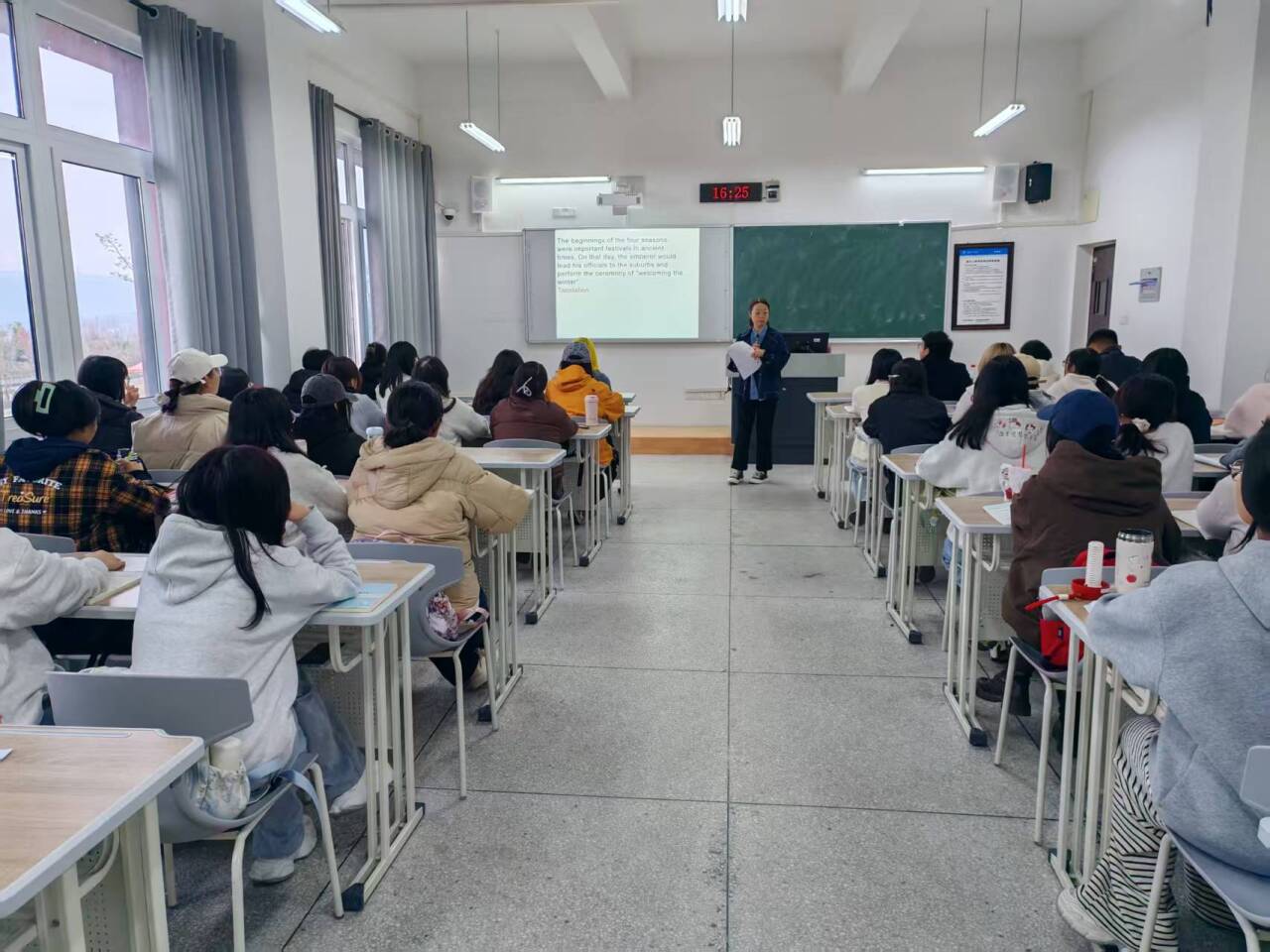 课堂以二十四节气“立冬”作为文化切入点,周老师巧妙地将英语阅读中的词汇精讲、阅读技巧、句型分析与翻译,融入到对冬季主题诗歌及传统文化的解读中。她引导学生不仅在文本研读中感受英语的语言之美,更在东西方文化的碰撞与交融中深化对本土文化的认同与理解。课程自然地融入了思政教育元素,引导学生结合“四立”(立春、立夏、立秋、立冬)蕴含的时序哲思,探讨为人处世之道,实现了知识传授与价值引领的有机统一。