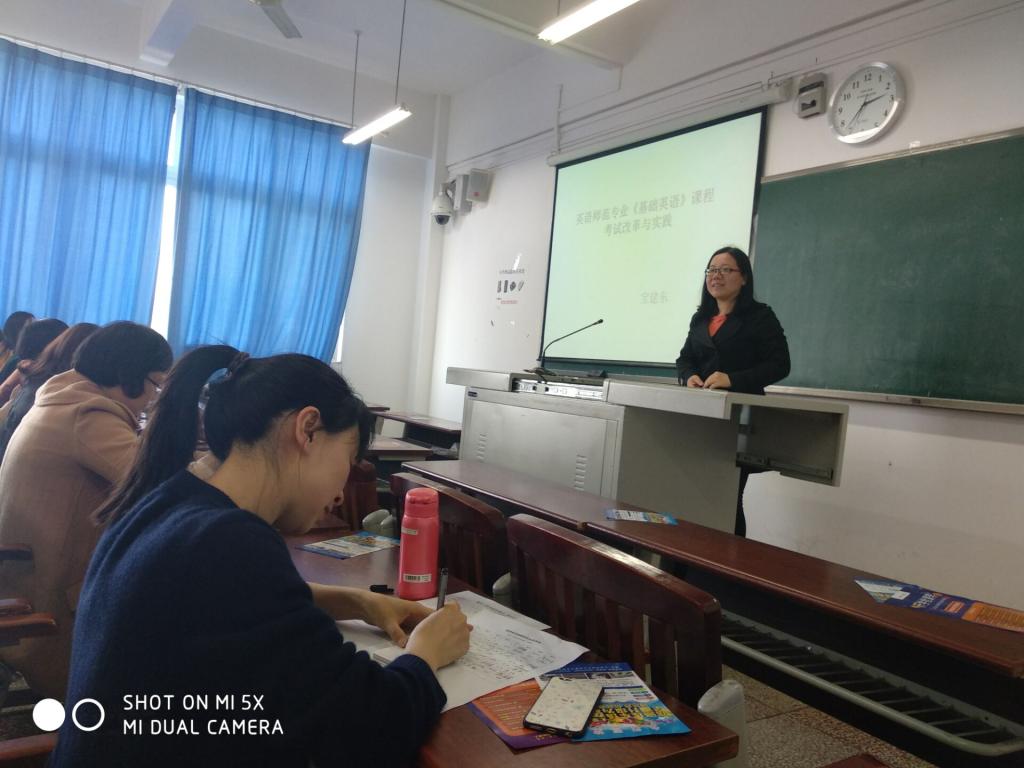 此次教研活动以“《基础英语》在线课程教学经验交流”为主题,由宝建东老师主讲,英语系副主任程谢老师主持。宝老师依托科研项目对《基础英语》课程进行了“听说”和“读写”两个方面的改革和实践,注重提升学生的学习兴趣并培养学生的专业技能。参会老师围绕英语系学生基础核心课程《基础英语》的课程改革进行了热烈讨论,主要涉及以下几个问题:基英课程改革过程中平时成绩的评定是否有相关细则,分数分配比例是否合理;学生的课外阅读怎样检测;学生的写作技能如何提升;课堂形式多样化与学生基础技能的培养是否冲突;基英教材的利用是否有效;学生的自主学习能力如何培养等等。