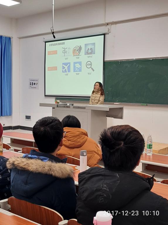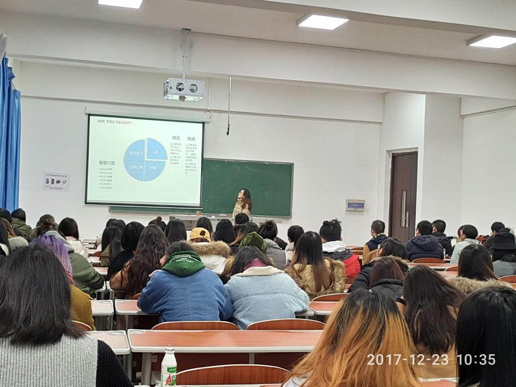 2017年12月23日,在理科楼群D1-312教室,重庆海德世集团副总经理助理喻佳为日语系全体学生做了《如何做好一个职场新人》的就业指导讲座。